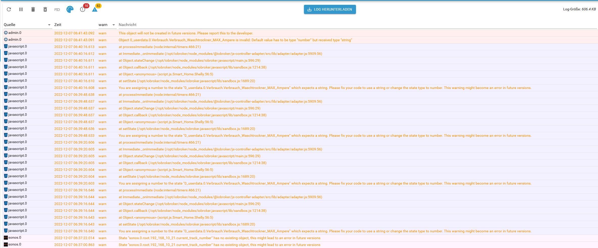 2022-12-07 06:40:16.608 - warn: javascript.0 (2169) You are assigning a number to the state "0_userdata.0.Verbrauch.Verbrauch_Waschtrockner_MAX_Ampere" which expects a string. Please fix your code to use a string or change the state type to number. This warning might become an error in future versions.