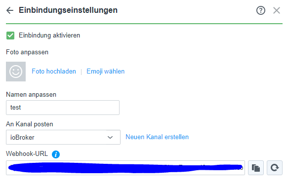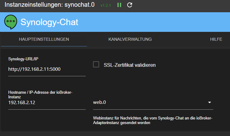 Den Synology Chat Server habe ich auf meiner DS installiert und einen neuen Kanal mit dem Namen ioBroker erstellt, sowie eingehende Webhooks erstellt und den Token in den Einstellungen des Adapters kopiert.