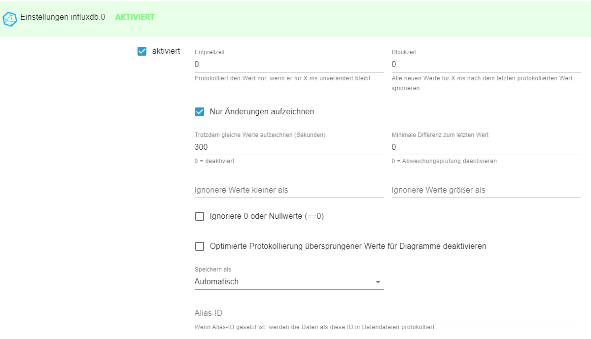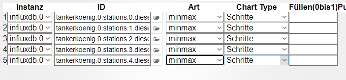 Ich logge mir von 5 umliegenden Tankstellen aus dem Tankerkönig den aktuellen Preis in meine influxdb2 Datenbank. Hier exemplarisch eine Einstellung des Datenpunktes: