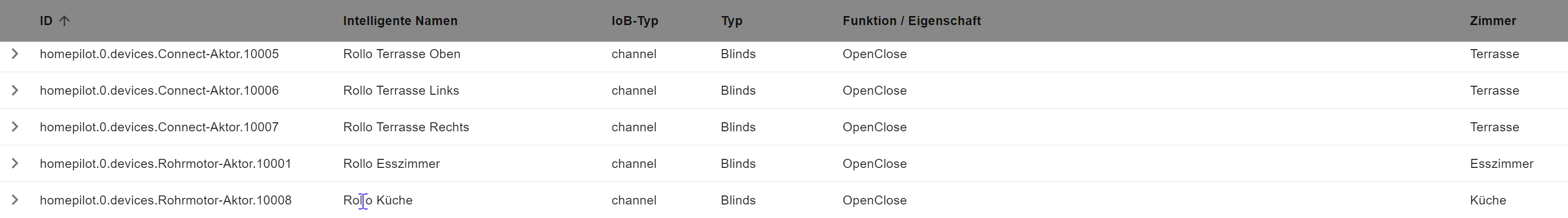 iot.0 2023-02-20 12:01:57.250 debug [GHOME] Created Google HOME device: Terrasserollo - blind - homepilot.0.devices.Connect-Aktor.10005 iot.0 2023-02-20 12:01:57.250 info [GHOME] homepilot.0.devices.Connect-Aktor.10005 is auto added with type blind. iot.0 2023-02-20 12:01:57.250 debug [GHOME] Type: blind iot.0 2023-02-20 12:01:57.243 debug [GHOME] Process: homepilot.0.devices.Connect-Aktor.10005 Terrasse Jalousien iot.0 2023-02-20 12:01:57.243 debug [GHOME] Process enum.functions.shutter iot.0 2023-02-20 12:01:57.243 debug [GHOME] Created Google HOME device: Kücherollo - blind - homepilot.0.devices.Rohrmotor-Aktor.10008 iot.0 2023-02-20 12:01:57.243 info [GHOME] homepilot.0.devices.Rohrmotor-Aktor.10008 is auto added with type blind. iot.0 2023-02-20 12:01:57.243 debug [GHOME] Type: blind iot.0 2023-02-20 12:01:57.236 debug [GHOME] Process: homepilot.0.devices.Rohrmotor-Aktor.10008 Küche RollladenIch habe auch versucht, im iot Adapter den Typ manuell zu ändern, das wird aber innerhalb von Sekunden wieder zurückgesetzt.