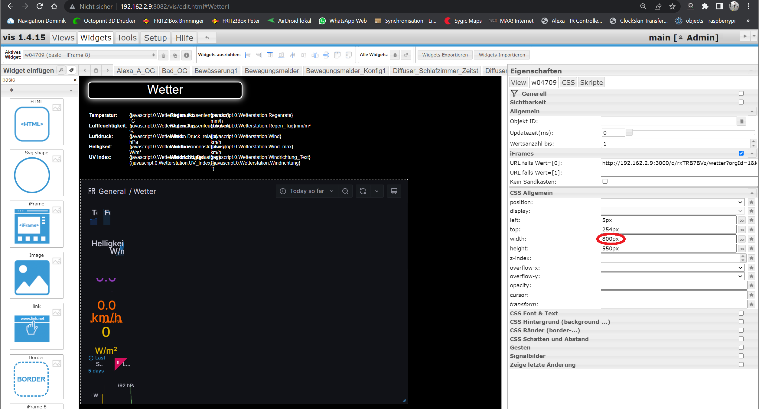 Dazu muss ich in der ioBroker Vis die Breite des iFrame Widgets erhöhen auf 800 px, dann werden die Diagramme, wie eig in Grafana richtig, untereinander dargestellt: