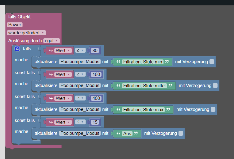 Für den Modus hätte ich das so gemacht, aber wenn ich so drüber schau, bekomm ich wahrscheinlich immer nur Filterstufe min, weil ich ja bei allen Bedingungen über 80 Watt bin. Wie kann ich das dann aber ändern, das ich bis zu einem gewissen Wattverbrauch eben auf einer Stufe bin und wenn die Wattzahl überschritten wird, die nächste Stufe kommt.