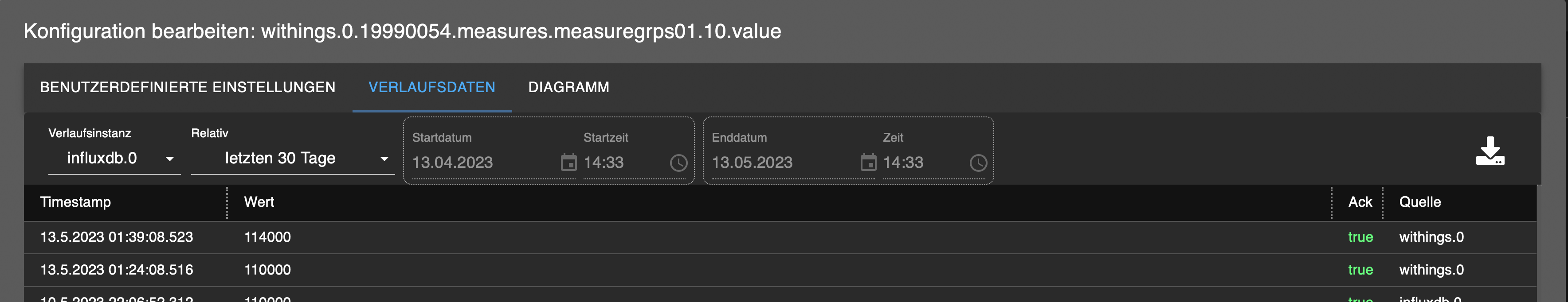 Nur bei Grafana sind die letzten Werte nicht zu sehen. Ich habe auch schonmal den Withings Adapter neugestartet, aber darin lag es nicht.