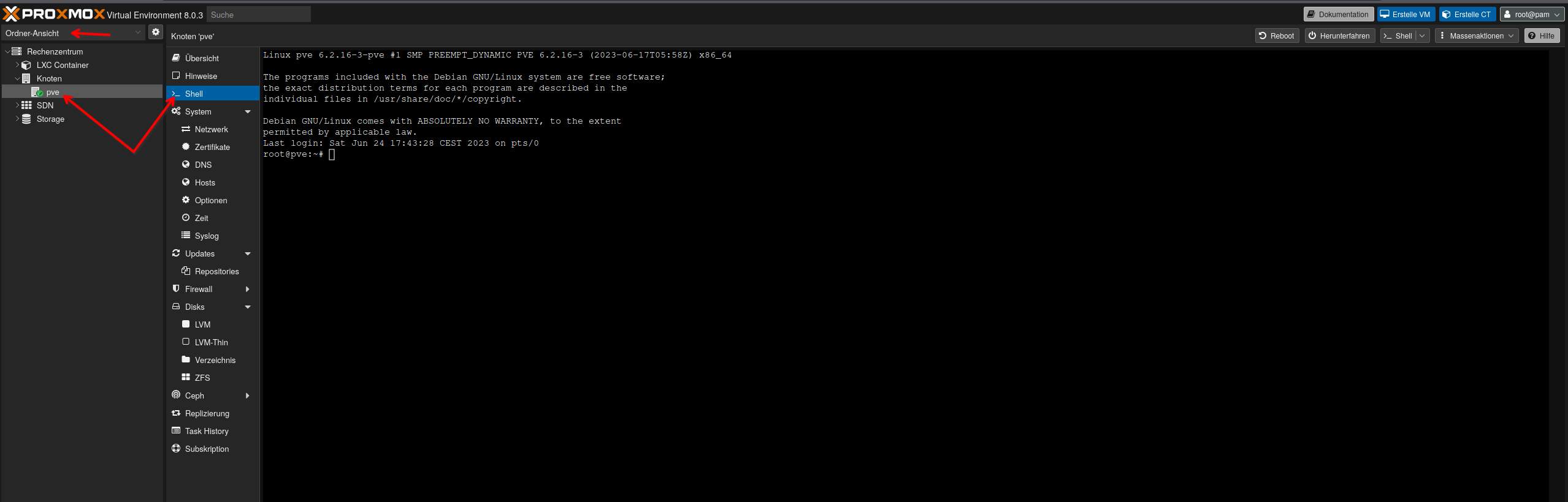 Wir melden uns an unserem Proxmox Server an, das kann entweder über die WEB-GUI oder über