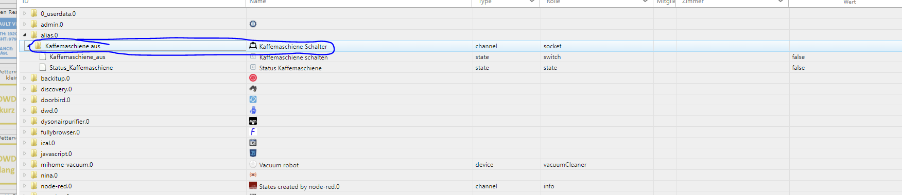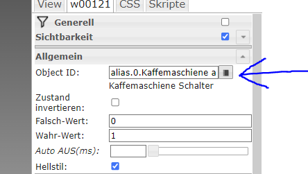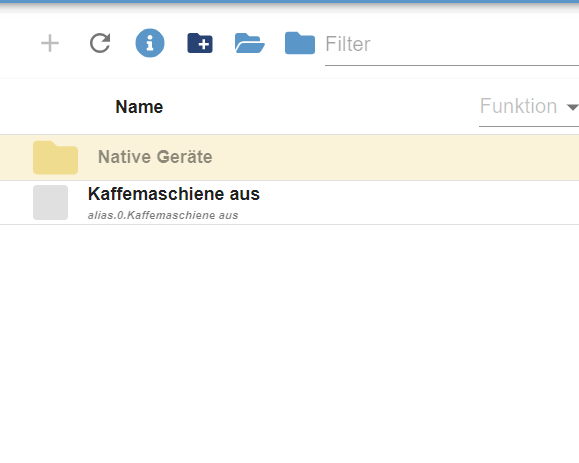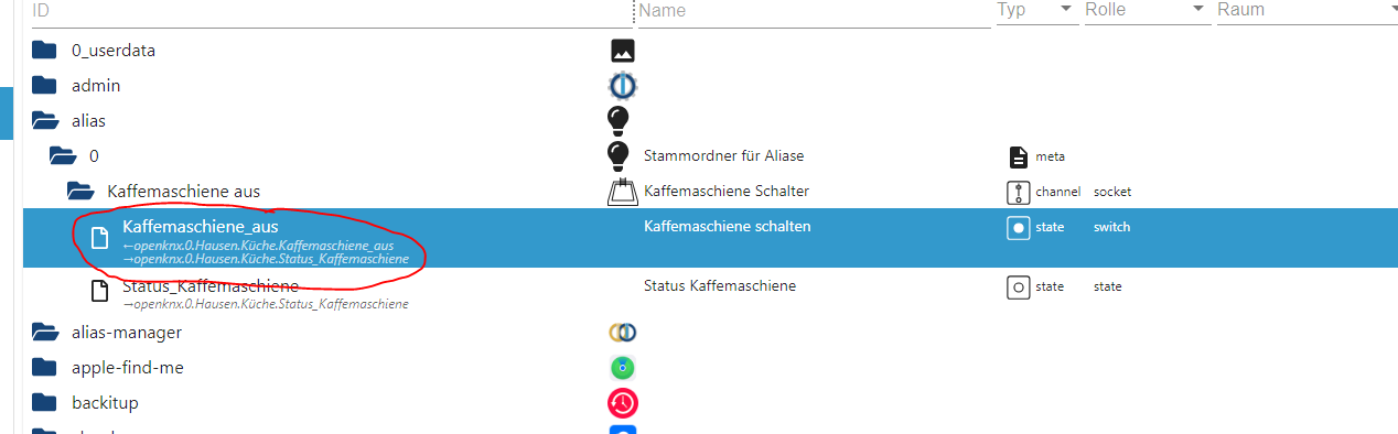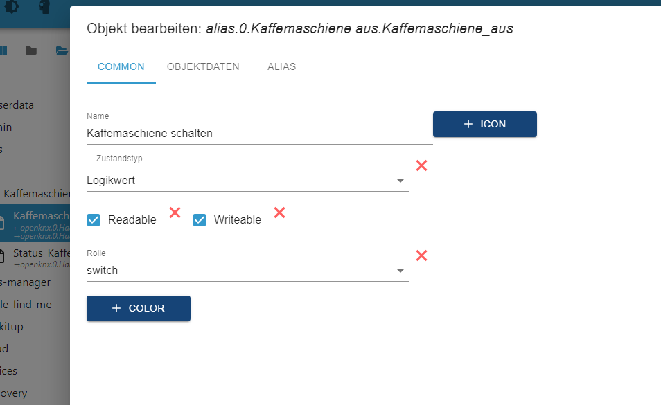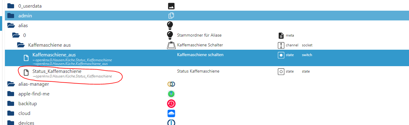 { "_id": "openknx.0.Hausen.Küche.Kaffemaschiene_aus", "type": "state", "common": { "type": "boolean", "read": true, "write": true, "desc": "Basetype: 1-bit value", "name": "Kaffemaschiene aus", "role": "switch", "states": { "0": "Off", "1": "On" } }, "native": { "address": "0/1/0", "answer_groupValueResponse": false, "autoread": true, "bitlength": 1, "dpt": "DPT1.001", "valuetype": "basic" }, "from": "system.adapter.openknx.0", "user": "system.user.admin", "ts": 1688816169199, "acl": { "object": 1636, "state": 1636, "owner": "system.user.admin", "ownerGroup": "system.group.administrator" } }Und das der Status Datenpunkt .