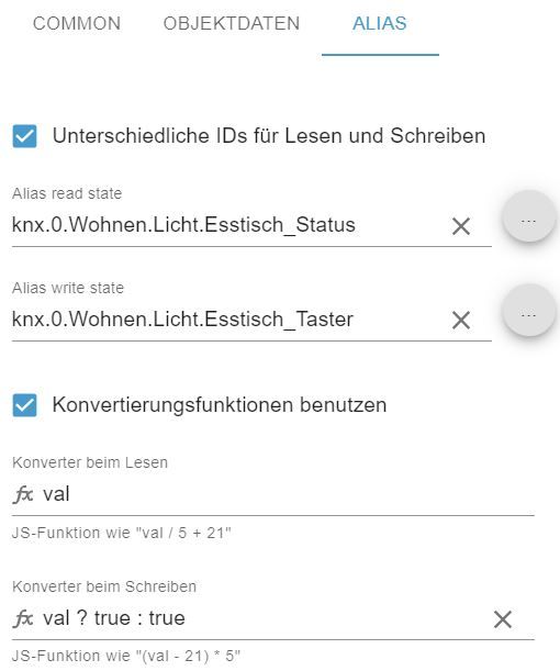 Ich kenne die KNX-Datenpunkte und deren Verhalten nicht. Der Alias zeigt den Zustand an, der im KNX-Status vorliegt.