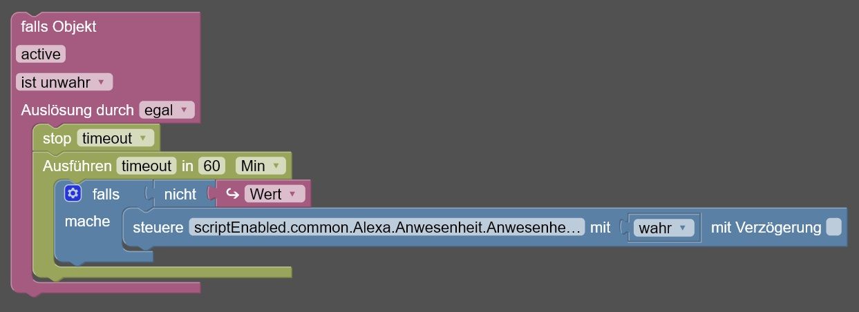 Verhindert eine voreilige Schaltung wenn z.B. mal einer den Müll raus bringt.Wie sieht diese Abfrage im Blockly aus?