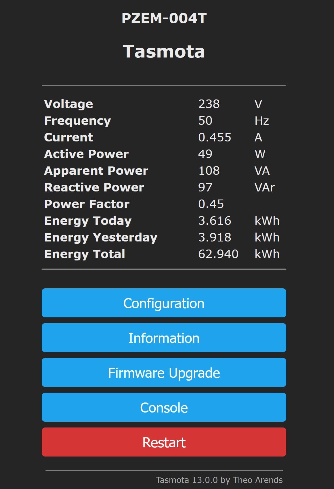 ich habe einen PZEM-004T V3 mit einem WemosD1 zur Messung des Energieverbrauchs installiert. Die Tasmota Firmware bringt auch die richtigen Daten auf der entsprechenden IP Adresse