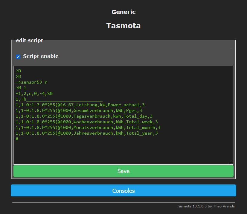 Ein Script erzeugt die Leistungsdaten in kW und kWh. Dieses ist einzugeben und zu starten: