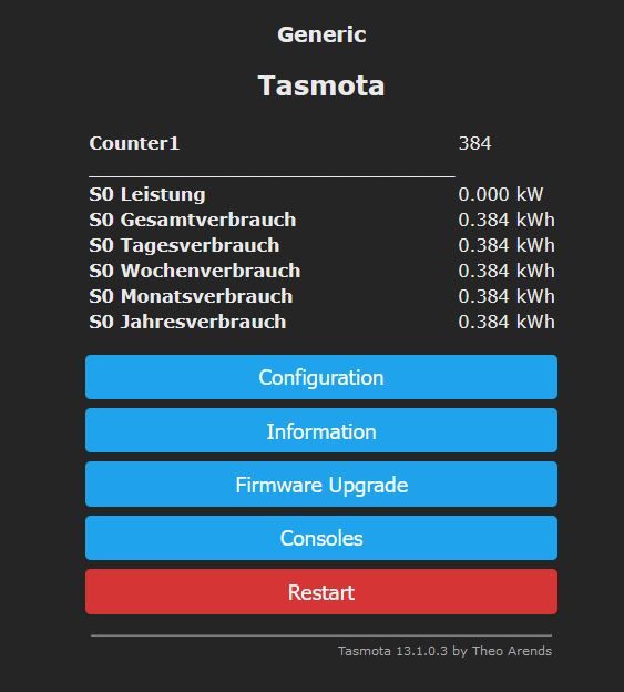 • Die Standard-Tasmota Firmware kann keinen S0 Impuls auswerten, deshalb muss man sich ein Custom Image mit dem Smart Meter Interface kompilieren
