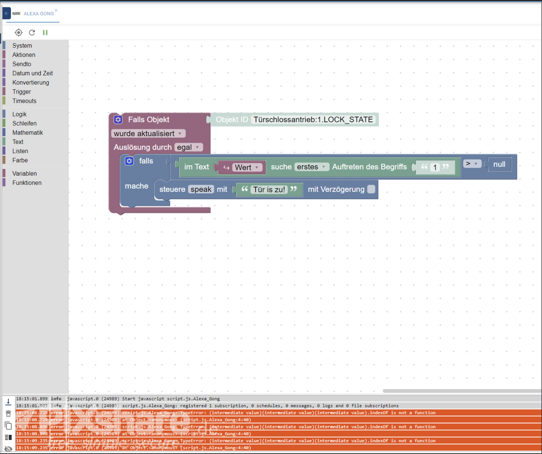 Leider bekomme ich (siehe Bild oben) sobald das Script getriggert wird die Fehler (auch siehe Bild) unten.