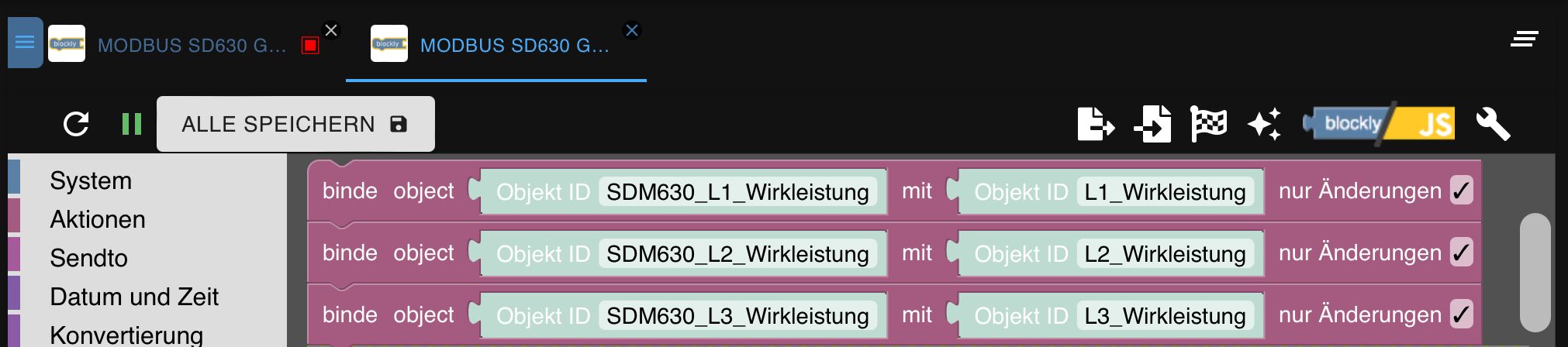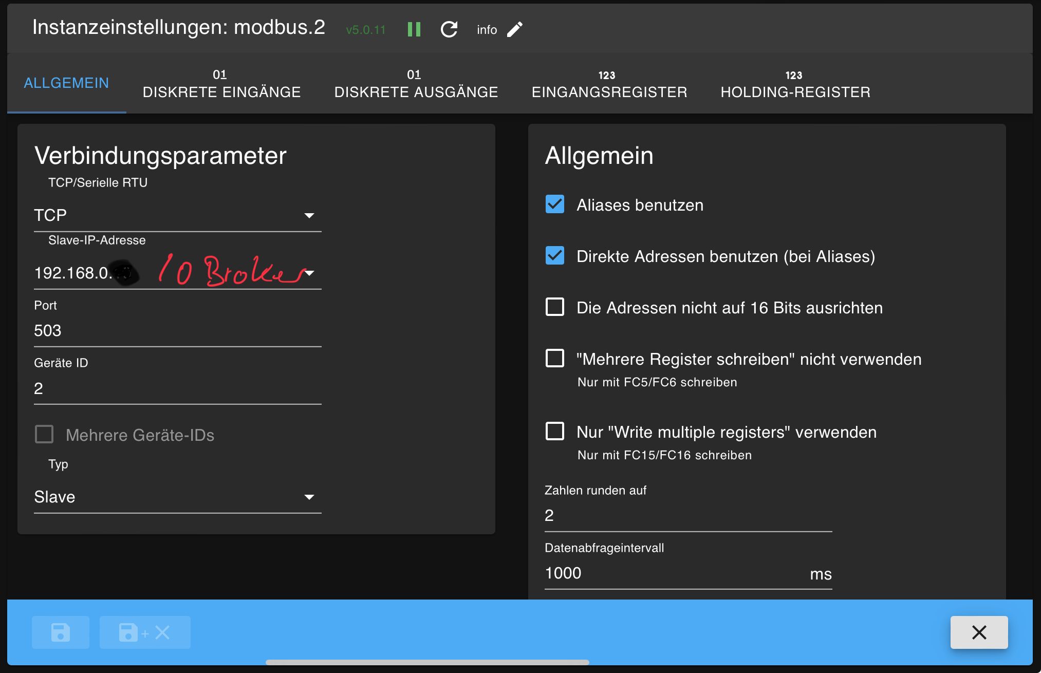 Iobroker (Modbus Instanz 1) ruft via Waveshare RS485 to ethernet interface die Daten vom Smartmeter SDM630 ab. (Habe ich zum laufen bekommen)iObroker Reicht die empfangenen Werte der Modbus 1 Instanz an die Modbus 2 Instatz weiter.