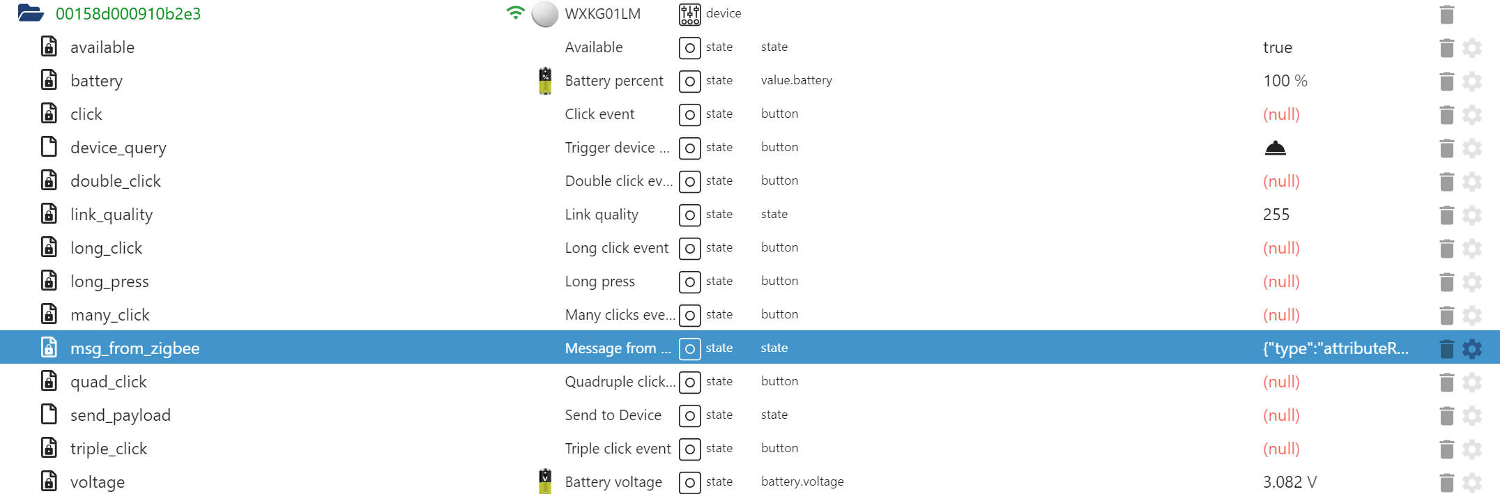 Ich habe einen Xiaomi Mi Wireless Switch WXKG01LM erfolgreich gepairt. Allerdings registriert der Adapter keine Aktionen des Buttons, lediglich die TransactionSequenceNumber im Datenpunk msg_from_zigbee wird aktualisiert. Alle anderen Datenpunkte zeigen (Null)