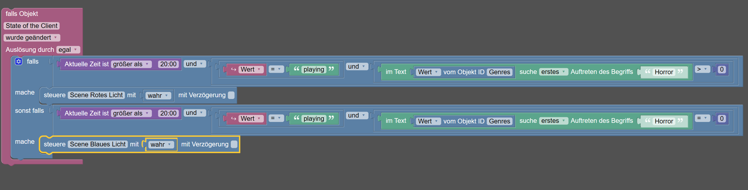 22.11.2023, 23:34:54.559 [info ]: javascript.0 (348) Stop script script.js.common.Emby_Lichtsteuerung 22.11.2023, 23:34:54.604 [info ]: javascript.0 (348) Start javascript script.js.common.Emby_Lichtsteuerung 22.11.2023, 23:34:54.615 [info ]: javascript.0 (348) script.js.common.Emby_Lichtsteuerung: subscribe: {"pattern":{"id":"emby.0.9978dbe503e74d4ab65de44921021f49.media.state","change":"ne","q":0},"name":"script.js.common.Emby_Lichtsteuerung"} 22.11.2023, 23:34:54.616 [info ]: javascript.0 (348) script.js.common.Emby_Lichtsteuerung: registered 1 subscription, 0 schedules, 0 messages, 0 logs and 0 file subscriptions 22.11.2023, 23:35:00.340 [info ]: javascript.0 (348) script.js.common.Emby_Lichtsteuerung: idle 22.11.2023, 23:35:09.816 [info ]: javascript.0 (348) script.js.common.Emby_Lichtsteuerung: playing 22.11.2023, 23:35:09.816 [info ]: javascript.0 (348) script.js.common.Emby_Lichtsteuerung: getState(id=emby.0.0625f91c9e5aa817d97f3c2df711452c.media.genres, timerId=undefined) => {"val":"Drama,Horror","ack":true,"ts":1700692187381,"q":0,"from":"system.adapter.emby.0","user":"system.user.admin","lc":1700692187104} 22.11.2023, 23:35:09.817 [info ]: javascript.0 (348) script.js.common.Emby_Lichtsteuerung: setForeignState(id=hue.0.Wohnzimmer.scene_rotes_licht, state={"val":true,"ack":false,"ts":1700692509817,"q":0,"from":"system.adapter.javascript.0","lc":1700683023856,"c":"script.js.common.Emby_Lichtsteuerung"}) 22.11.2023, 23:35:18.575 [info ]: javascript.0 (348) script.js.common.Emby_Lichtsteuerung: idle 22.11.2023, 23:35:27.638 [info ]: javascript.0 (348) script.js.common.Emby_Lichtsteuerung: playing 22.11.2023, 23:35:27.639 [info ]: javascript.0 (348) script.js.common.Emby_Lichtsteuerung: getState(id=emby.0.0625f91c9e5aa817d97f3c2df711452c.media.genres, timerId=undefined) => {"val":"Drama,Horror","ack":true,"ts":1700692187381,"q":0,"from":"system.adapter.emby.0","user":"system.user.admin","lc":1700692187104} 22.11.2023, 23:35:27.639 [info ]: javascript.0 (348) script.js.common.Emby_Lichtsteuerung: setForeignState(id=hue.0.Wohnzimmer.scene_rotes_licht, state={"val":true,"ack":false,"ts":1700692527639,"q":0,"from":"system.adapter.javascript.0","lc":1700683023856,"c":"script.js.common.Emby_Lichtsteuerung"})@Armilar und so schauts auf dem PC aus, wo auch die Farbschalte richtig funktioniert:
