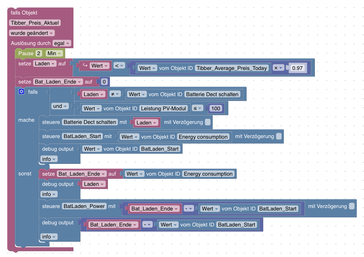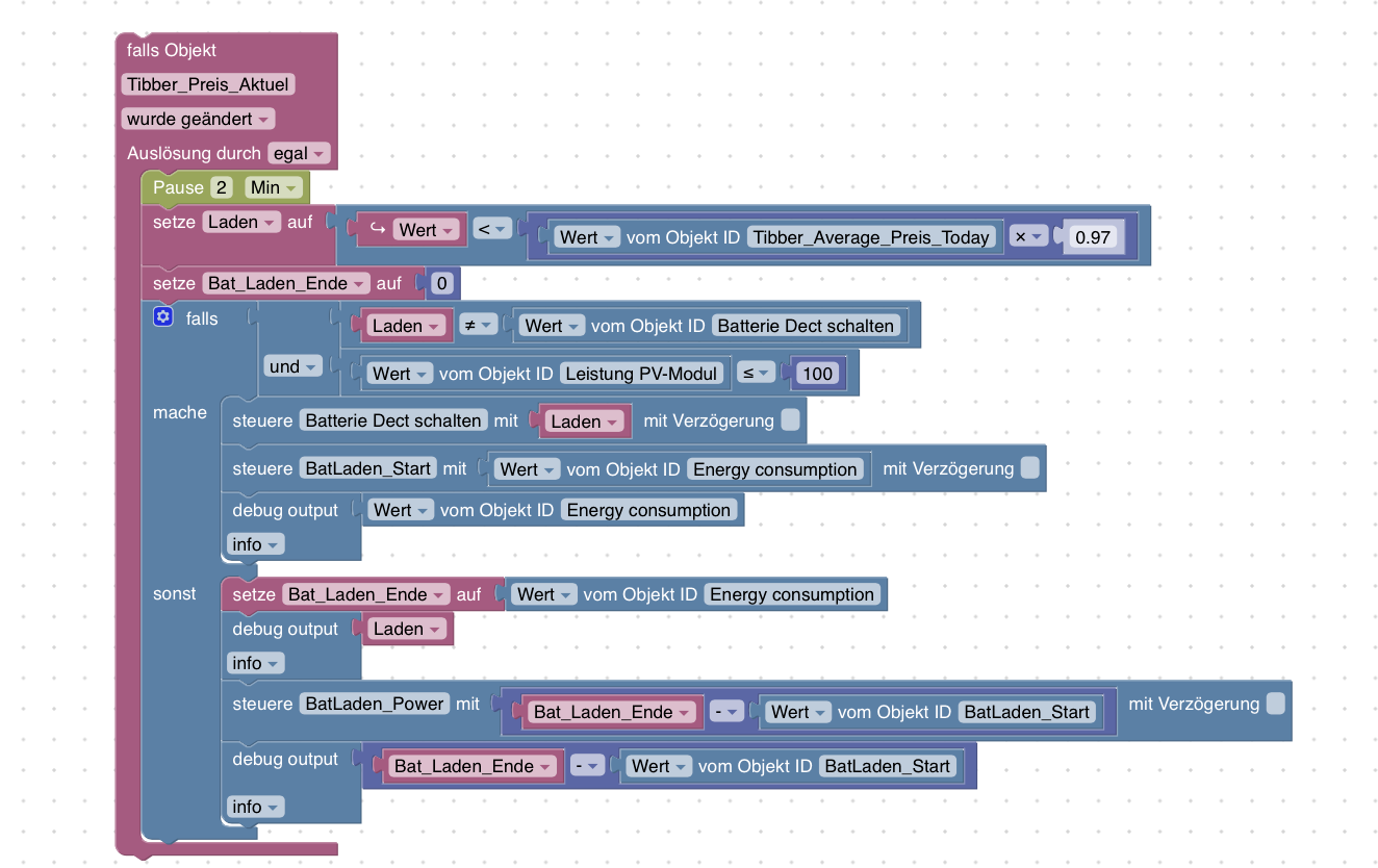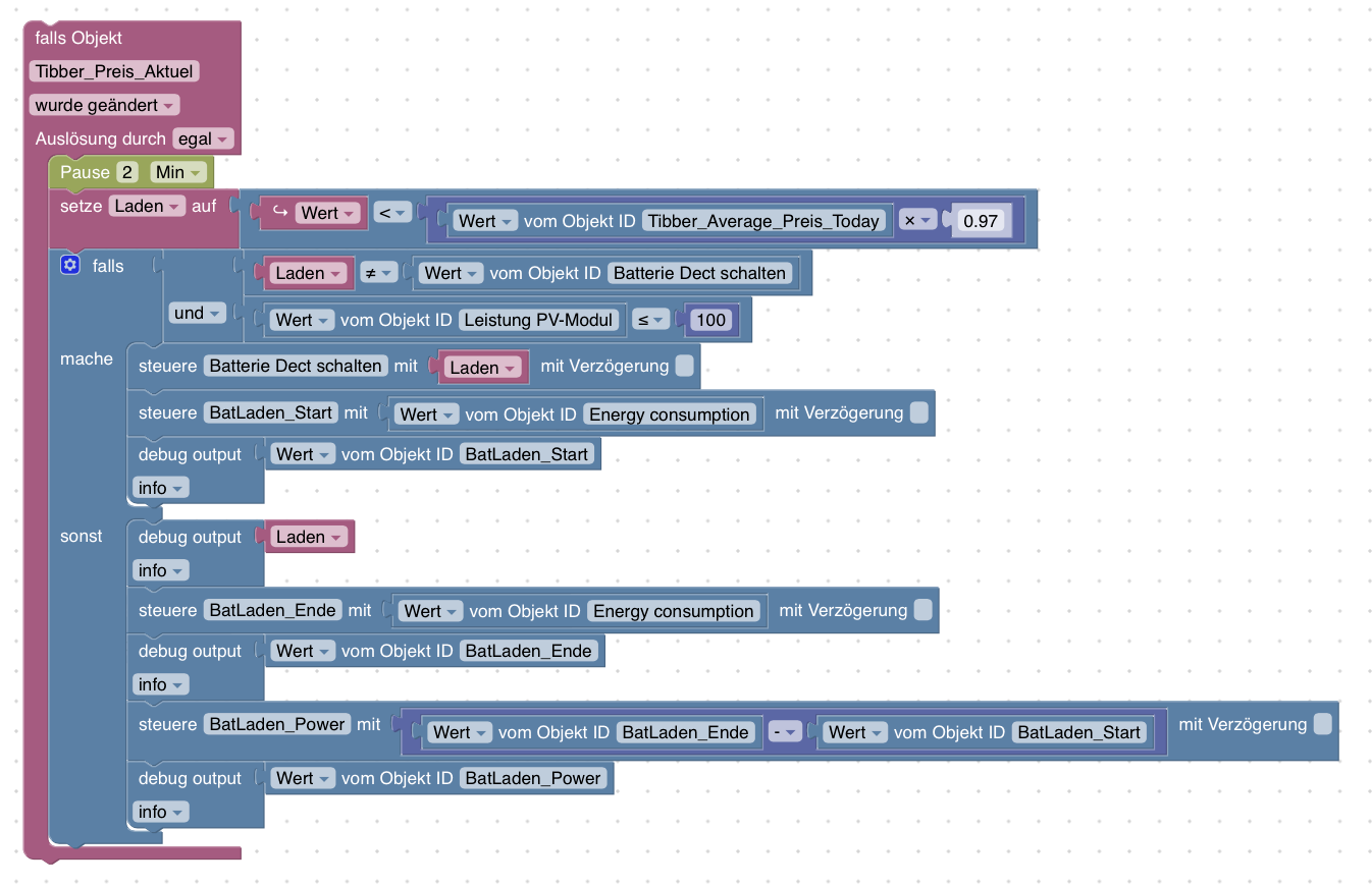 <xml xmlns="https://developers.google.com/blockly/xml"> <variables> <variable id="6#Wj|F%:%yH*qMf~R:,M">Laden</variable> </variables> <block type="on" id="yx*Z%?C-kV9kZ|PalqBS" x="-562" y="-287"> <field name="OID">alias.0.Variable.Energiefluss.Tibber_Preis_Aktuel</field> <field name="CONDITION">ne</field> <field name="ACK_CONDITION"></field> <statement name="STATEMENT"> <block type="timeouts_wait" id="FWGa/(Zxl++,[4uUXlrK"> <field name="DELAY">2</field> <field name="UNIT">min</field> <next> <block type="variables_set" id="JB)i@~Nmnw42li%M;KJw"> <field name="VAR" id="6#Wj|F%:%yH*qMf~R:,M">Laden</field> <value name="VALUE"> <block type="logic_compare" id=";6Gjp/TIMQtE?WuqFHtT"> <field name="OP">LT</field> <value name="A"> <block type="on_source" id="sNqbL+fq^6^E^DQ:nA2N"> <field name="ATTR">state.val</field> </block> </value> <value name="B"> <block type="math_arithmetic" id="$S.gQAuha!OK=p)Zo7tI"> <field name="OP">MULTIPLY</field> <value name="A"> <shadow type="math_number" id="|g@P4)@R[{X7C:Ahjvck"> <field name="NUM">1</field> </shadow> <block type="get_value" id="Jed@.A?MMB_I-o(bqdW1"> <field name="ATTR">val</field> <field name="OID">alias.0.Variable.Energiefluss.Tibber_Average_Preis_Today</field> </block> </value> <value name="B"> <shadow type="math_number" id=");4{jN%Be5]rtIn#-TkM"> <field name="NUM">0.97</field> </shadow> </value> </block> </value> </block> </value> <next> <block type="controls_if" id="bwD0)KqNOy*O6jB#ovF4"> <mutation else="1"></mutation> <value name="IF0"> <block type="logic_operation" id="wkD0SDG99;{gu#rPuWzT" inline="false"> <field name="OP">AND</field> <value name="A"> <block type="logic_compare" id="r[E.5+I=~N]_Wm0P(elC"> <field name="OP">NEQ</field> <value name="A"> <block type="variables_get" id="jV#0`i=ZJiKNDf?y)xO2"> <field name="VAR" id="6#Wj|F%:%yH*qMf~R:,M">Laden</field> </block> </value> <value name="B"> <block type="get_value" id="ok6P*}*`6@zDj^eYmkIU"> <field name="ATTR">val</field> <field name="OID">alias.0.Variable.Soyo_inteligent_schalten.Soyo_Dect_schalten</field> </block> </value> </block> </value> <value name="B"> <block type="logic_compare" id="AWo~XeceneG#rz7)QT9o"> <field name="OP">LTE</field> <value name="A"> <block type="get_value" id="q;@RrG[L]cK;.8XfUO]x"> <field name="ATTR">val</field> <field name="OID">alias.0.Variable.Energiefluss.Leistung_PV-Modul</field> </block> </value> <value name="B"> <block type="math_number" id="|KRrW{.s/QX.BGYw1{Tn"> <field name="NUM">100</field> </block> </value> </block> </value> </block> </value> <statement name="DO0"> <block type="control" id="L[2p?@rnU6GFCYhWpx/9"> <mutation xmlns="http://www.w3.org/1999/xhtml" delay_input="false"></mutation> <field name="OID">alias.0.Variable.Soyo_inteligent_schalten.Soyo_Dect_schalten</field> <field name="WITH_DELAY">FALSE</field> <value name="VALUE"> <block type="variables_get" id="^KqUlbc!uM9Gu!`}5ji|"> <field name="VAR" id="6#Wj|F%:%yH*qMf~R:,M">Laden</field> </block> </value> <next> <block type="control" id="+t3%ZOFyrY932R2O::y*"> <mutation xmlns="http://www.w3.org/1999/xhtml" delay_input="false"></mutation> <field name="OID">0_userdata.0.Eigene_Datenpunkte.BatLaden_Start</field> <field name="WITH_DELAY">FALSE</field> <value name="VALUE"> <block type="get_value" id="7hisw^CpvBCU-,c=5)P6"> <field name="ATTR">val</field> <field name="OID">fritzdect.0.DECT_116570243229.energy</field> </block> </value> </block> </next> </block> </statement> <statement name="ELSE"> <block type="control" id="ax-RNF;~i7^qK:mvD:D/"> <mutation xmlns="http://www.w3.org/1999/xhtml" delay_input="false"></mutation> <field name="OID">0_userdata.0.Eigene_Datenpunkte.BatLaden_Ende</field> <field name="WITH_DELAY">FALSE</field> <value name="VALUE"> <block type="get_value" id="d#=qD%=qRuwE|/.@(F,b"> <field name="ATTR">val</field> <field name="OID">fritzdect.0.DECT_116570243229.energy</field> </block> </value> <next> <block type="control" id="9rGIM8)YArQt#0kH}LI*"> <mutation xmlns="http://www.w3.org/1999/xhtml" delay_input="false"></mutation> <field name="OID">0_userdata.0.Eigene_Datenpunkte.BatLaden_Power</field> <field name="WITH_DELAY">FALSE</field> <value name="VALUE"> <block type="math_arithmetic" id="i)%%x#|W#X[pN[b_r]K%"> <field name="OP">MINUS</field> <value name="A"> <shadow type="math_number" id="}y@snz@3.R!2mHn]QJs["> <field name="NUM">1</field> </shadow> <block type="get_value" id="_!#!F,yGWa!0)gmjzX$-"> <field name="ATTR">val</field> <field name="OID">0_userdata.0.Eigene_Datenpunkte.BatLaden_Ende</field> </block> </value> <value name="B"> <shadow type="math_number" id="9`TlZ=Q9F`w/TKD1-.*6"> <field name="NUM">1</field> </shadow> <block type="get_value" id="x({#-a_ehw1jA,k_H11L"> <field name="ATTR">val</field> <field name="OID">0_userdata.0.Eigene_Datenpunkte.BatLaden_Start</field> </block> </value> </block> </value> <next> <block type="debug" id="vVSWhM_msZcd7Qe6=}d."> <field name="Severity">log</field> <value name="TEXT"> <shadow type="text" id="E}xukGr8GQ3AvIHU/{B%"> <field name="TEXT">test</field> </shadow> <block type="get_value" id="(~(`Tt)z!6r.icGm;Hee"> <field name="ATTR">val</field> <field name="OID">0_userdata.0.Eigene_Datenpunkte.BatLaden_Power</field> </block> </value> </block> </next> </block> </next> </block> </statement> </block> </next> </block> </next> </block> </statement> </block> </xml> -