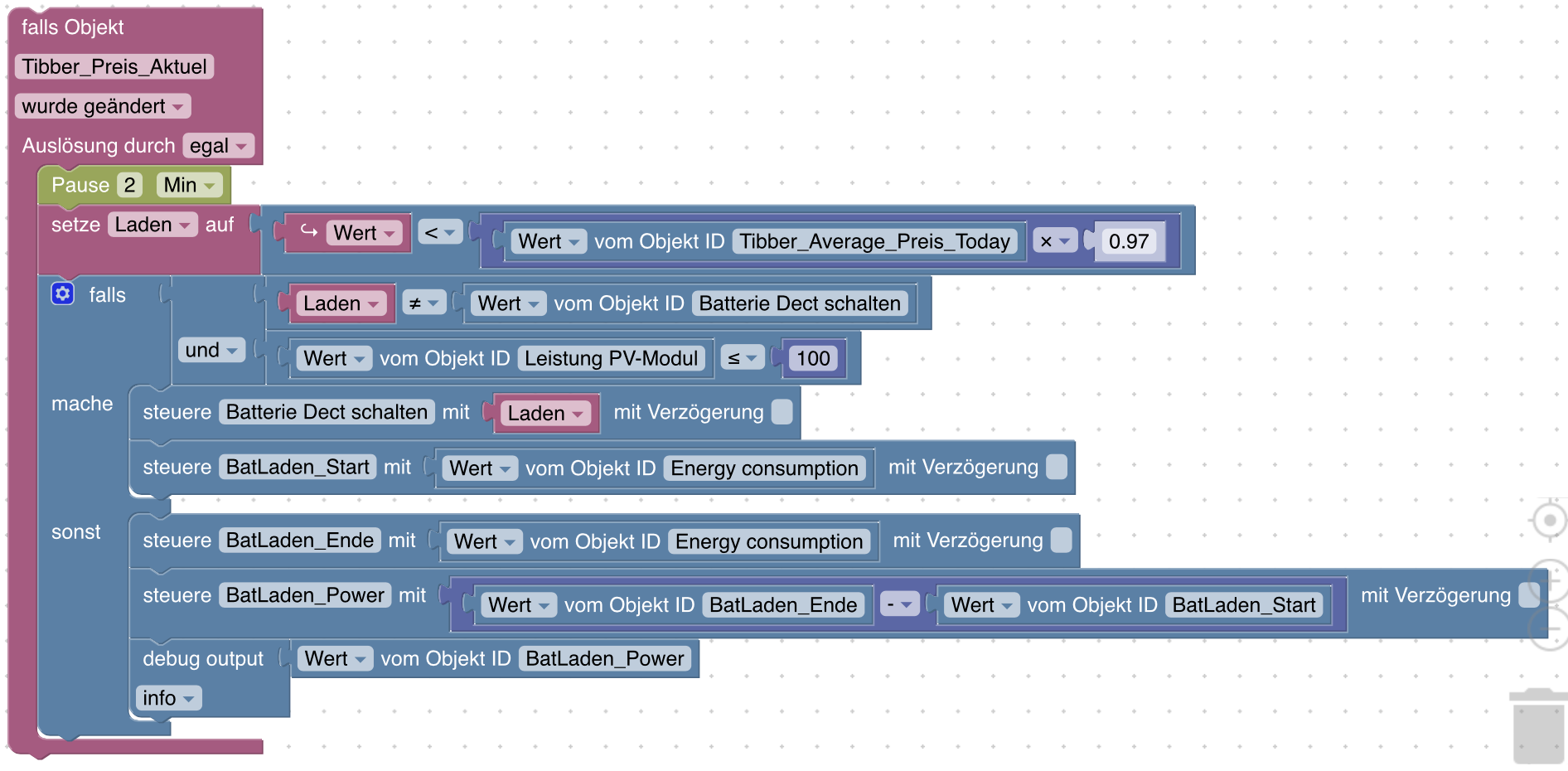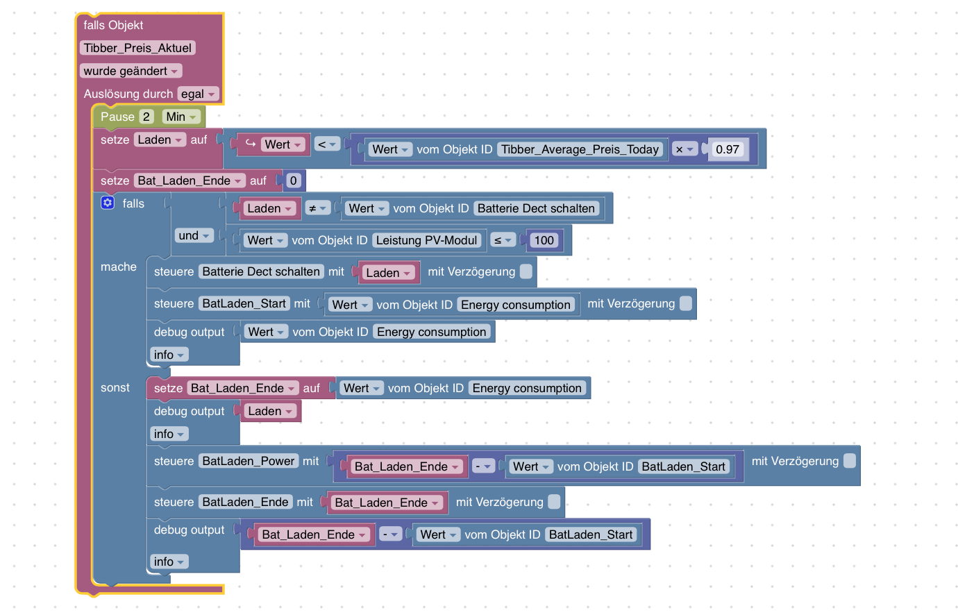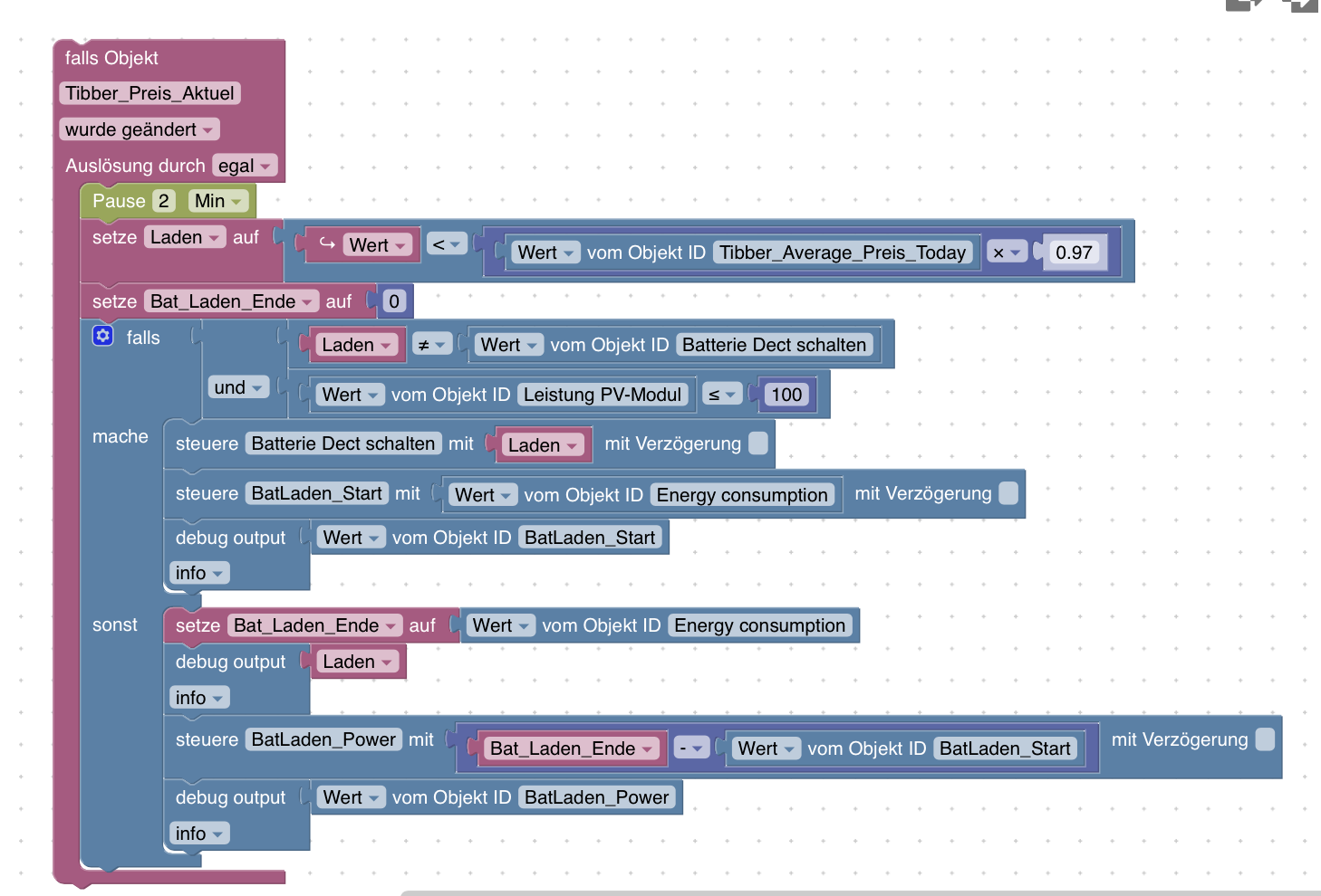 <xml xmlns="https://developers.google.com/blockly/xml"> <variables> <variable id="6#Wj|F%:%yH*qMf~R:,M">Laden</variable> </variables> <block type="on" id="yx*Z%?C-kV9kZ|PalqBS" x="-562" y="-287"> <field name="OID">alias.0.Variable.Energiefluss.Tibber_Preis_Aktuel</field> <field name="CONDITION">ne</field> <field name="ACK_CONDITION"></field> <statement name="STATEMENT"> <block type="timeouts_wait" id="FWGa/(Zxl++,[4uUXlrK"> <field name="DELAY">2</field> <field name="UNIT">min</field> <next> <block type="variables_set" id="JB)i@~Nmnw42li%M;KJw"> <field name="VAR" id="6#Wj|F%:%yH*qMf~R:,M">Laden</field> <value name="VALUE"> <block type="logic_compare" id=";6Gjp/TIMQtE?WuqFHtT"> <field name="OP">LT</field> <value name="A"> <block type="on_source" id="sNqbL+fq^6^E^DQ:nA2N"> <field name="ATTR">state.val</field> </block> </value> <value name="B"> <block type="math_arithmetic" id="$S.gQAuha!OK=p)Zo7tI"> <field name="OP">MULTIPLY</field> <value name="A"> <shadow type="math_number" id="|g@P4)@R[{X7C:Ahjvck"> <field name="NUM">1</field> </shadow> <block type="get_value" id="Jed@.A?MMB_I-o(bqdW1"> <field name="ATTR">val</field> <field name="OID">alias.0.Variable.Energiefluss.Tibber_Average_Preis_Today</field> </block> </value> <value name="B"> <shadow type="math_number" id=");4{jN%Be5]rtIn#-TkM"> <field name="NUM">0.97</field> </shadow> </value> </block> </value> </block> </value> <next> <block type="controls_if" id="bwD0)KqNOy*O6jB#ovF4"> <mutation else="1"></mutation> <value name="IF0"> <block type="logic_operation" id="wkD0SDG99;{gu#rPuWzT" inline="false"> <field name="OP">AND</field> <value name="A"> <block type="logic_compare" id="r[E.5+I=~N]_Wm0P(elC"> <field name="OP">NEQ</field> <value name="A"> <block type="variables_get" id="jV#0`i=ZJiKNDf?y)xO2"> <field name="VAR" id="6#Wj|F%:%yH*qMf~R:,M">Laden</field> </block> </value> <value name="B"> <block type="get_value" id="ok6P*}*`6@zDj^eYmkIU"> <field name="ATTR">val</field> <field name="OID">alias.0.Variable.Soyo_inteligent_schalten.Soyo_Dect_schalten</field> </block> </value> </block> </value> <value name="B"> <block type="logic_compare" id="AWo~XeceneG#rz7)QT9o"> <field name="OP">LTE</field> <value name="A"> <block type="get_value" id="q;@RrG[L]cK;.8XfUO]x"> <field name="ATTR">val</field> <field name="OID">alias.0.Variable.Energiefluss.Leistung_PV-Modul</field> </block> </value> <value name="B"> <block type="math_number" id="|KRrW{.s/QX.BGYw1{Tn"> <field name="NUM">100</field> </block> </value> </block> </value> </block> </value> <statement name="DO0"> <block type="control" id="L[2p?@rnU6GFCYhWpx/9"> <mutation xmlns="http://www.w3.org/1999/xhtml" delay_input="false"></mutation> <field name="OID">alias.0.Variable.Soyo_inteligent_schalten.Soyo_Dect_schalten</field> <field name="WITH_DELAY">FALSE</field> <value name="VALUE"> <block type="variables_get" id="^KqUlbc!uM9Gu!`}5ji|"> <field name="VAR" id="6#Wj|F%:%yH*qMf~R:,M">Laden</field> </block> </value> <next> <block type="control" id="+t3%ZOFyrY932R2O::y*"> <mutation xmlns="http://www.w3.org/1999/xhtml" delay_input="false"></mutation> <field name="OID">0_userdata.0.Eigene_Datenpunkte.BatLaden_Start</field> <field name="WITH_DELAY">FALSE</field> <value name="VALUE"> <block type="get_value" id="7hisw^CpvBCU-,c=5)P6"> <field name="ATTR">val</field> <field name="OID">fritzdect.0.DECT_116570243229.energy</field> </block> </value> </block> </next> </block> </statement> <statement name="ELSE"> <block type="control" id="ax-RNF;~i7^qK:mvD:D/"> <mutation xmlns="http://www.w3.org/1999/xhtml" delay_input="false"></mutation> <field name="OID">0_userdata.0.Eigene_Datenpunkte.BatLaden_Ende</field> <field name="WITH_DELAY">FALSE</field> <value name="VALUE"> <block type="get_value" id="d#=qD%=qRuwE|/.@(F,b"> <field name="ATTR">val</field> <field name="OID">fritzdect.0.DECT_116570243229.energy</field> </block> </value> <next> <block type="control" id="9rGIM8)YArQt#0kH}LI*"> <mutation xmlns="http://www.w3.org/1999/xhtml" delay_input="false"></mutation> <field name="OID">0_userdata.0.Eigene_Datenpunkte.BatLaden_Power</field> <field name="WITH_DELAY">FALSE</field> <value name="VALUE"> <block type="math_arithmetic" id="i)%%x#|W#X[pN[b_r]K%"> <field name="OP">MINUS</field> <value name="A"> <shadow type="math_number" id="}y@snz@3.R!2mHn]QJs["> <field name="NUM">1</field> </shadow> <block type="get_value" id="_!#!F,yGWa!0)gmjzX$-"> <field name="ATTR">val</field> <field name="OID">0_userdata.0.Eigene_Datenpunkte.BatLaden_Ende</field> </block> </value> <value name="B"> <shadow type="math_number" id="9`TlZ=Q9F`w/TKD1-.*6"> <field name="NUM">1</field> </shadow> <block type="get_value" id="x({#-a_ehw1jA,k_H11L"> <field name="ATTR">val</field> <field name="OID">0_userdata.0.Eigene_Datenpunkte.BatLaden_Start</field> </block> </value> </block> </value> <next> <block type="debug" id="vVSWhM_msZcd7Qe6=}d."> <field name="Severity">log</field> <value name="TEXT"> <shadow type="text" id="E}xukGr8GQ3AvIHU/{B%"> <field name="TEXT">test</field> </shadow> <block type="get_value" id="(~(`Tt)z!6r.icGm;Hee"> <field name="ATTR">val</field> <field name="OID">0_userdata.0.Eigene_Datenpunkte.BatLaden_Power</field> </block> </value> </block> </next> </block> </next> </block> </statement> </block> </next> </block> </next> </block> </statement> </block> </xml> -