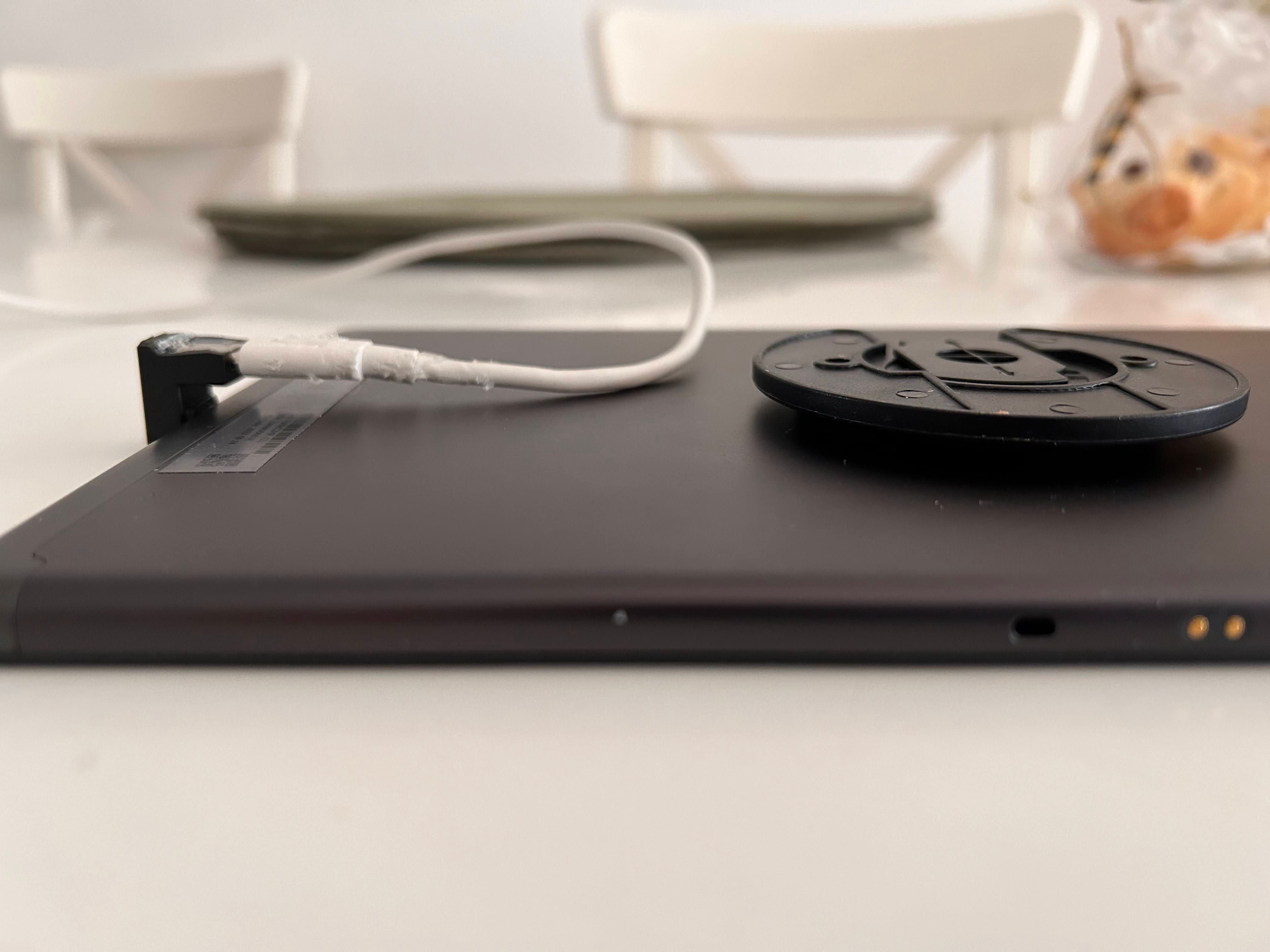 Leider habe ich keine Bilder mehr von der Befestigung des USB Steckers, dieser muss jedenfalls mit Heißkleber o.ä. direkt hinter dem Tablet festgeklebt werden, die Platzierung hierbei ist entscheidend, damit das Tablet am Ende gerade hängt und sicher laden kann. Wichtig ist nur den USB Stecker vom Kabel festkleben, nicht den Winkelstecker (sonst lässt sich das Tablet nicht mehr abnehmen)....
