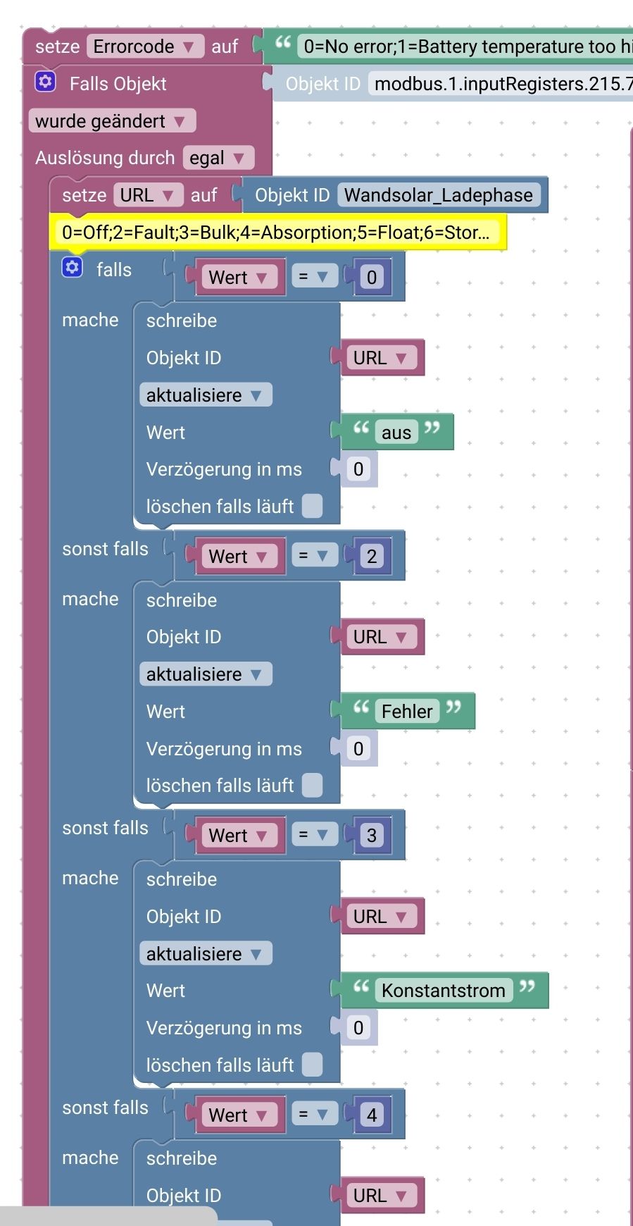 javascript.1 2024-01-08 18:51:29.197 info script.js.Victron.Wandsolardaten: Input current too high javascript.1 2024-01-08 18:51:29.196 info script.js.Victron.Wandsolardaten: 34=Input current too high javascript.1 2024-01-08 18:51:22.253 info script.js.Victron.Wandsolardaten: Charger temperature too high javascript.1 2024-01-08 18:51:22.252 info script.js.Victron.Wandsolardaten: 17=Charger temperature too high javascript.1 2024-01-08 18:51:17.433 info script.js.Victron.Wandsolardaten: attery voltage sense miswired (-) javascript.1 2024-01-08 18:51:17.433 info script.js.Victron.Wandsolardaten: 7=Battery voltage sense miswired (-) javascript.1 2024-01-08 18:51:11.857 info script.js.Victron.Wandsolardaten: o error javascript.1 2024-01-08 18:51:11.856 info script.js.Victron.Wandsolardaten: 0=No errorhier nochmal das zugehörige Blockly