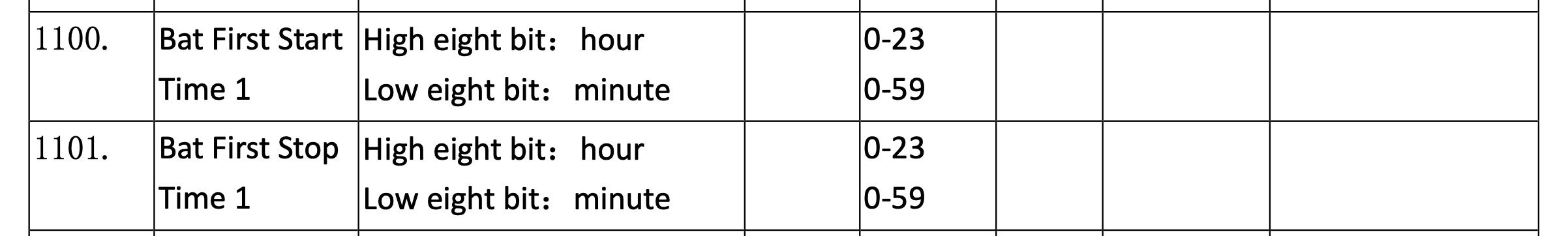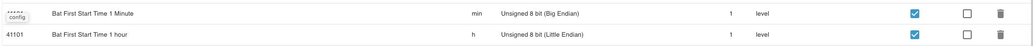 setState('modbus.0.holdingRegisters.41101_Bat_First_Start_Time_1_hour'/*41101 Bat First Start Time 1 Hour*/,10); setState('modbus.0.holdingRegisters.41101_Bat_First_Start_Time_1_Minute'/*41101 Bat First Start Time 1 Minute*/,5);diese Javascriptbefehle ändern die beiden Objekte kurz auf die gewünschte Zeit (Zahl ist dann grün). Sobald allerdings die beiden Register aber vom Modbus Adapter neu ausgelesen werden, wird die Stundenzahl rot und dann auf 0 gesetzt. Die Minutenzahl wird akzeptiert und bleibt.