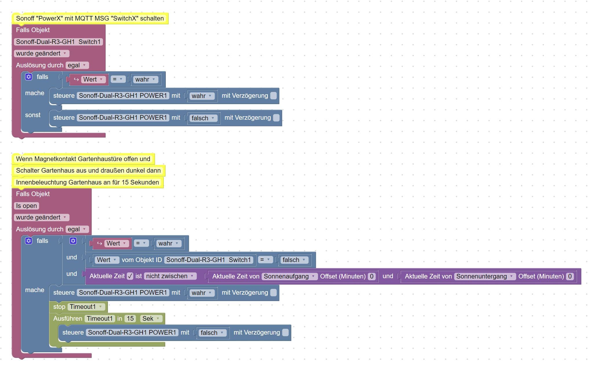 ich habe folgende Problemstellung: Die Innenbeleuchtung der Gartenhütte soll automatisch für 15 Sekunden angehen, wenn ich die Türe vom Gartenhaus aufmache. Im Gartenhaus verbaut ist ein Sonoff Dual mit physikalischem Ein/Aus Schalter (kein Taster). Da der Sonoff im "Switchmode 1" keine MQTT Messages sendete (SwichX State -> PowerX State) habe ich den Sonoff Power mit "Switchmode 15" quasi entkoppelt, d.h. jetzt kommen SwitchX MQTTs, aber ich muss den PowerX durch den gesendeten SwitchX ebenfalls über ein Script steuern. Das angehängte Blockly macht jetzt soweit was es soll und die physikalische Schalterstellung hat Prio über die Türkontakt-/Zeitsteuerung.