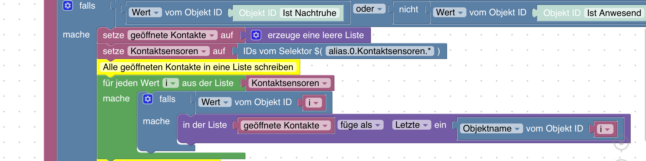 Wie kann ich diese Werte nun so miteinander verknüpfen, dass ich für alle Einträge in der Liste "geöffnete Kontakte" herausfinde, ob in den Einträgen für Alarm_Nachtruhe bzw. Alarm_abwesend wahr oder falsch steht?