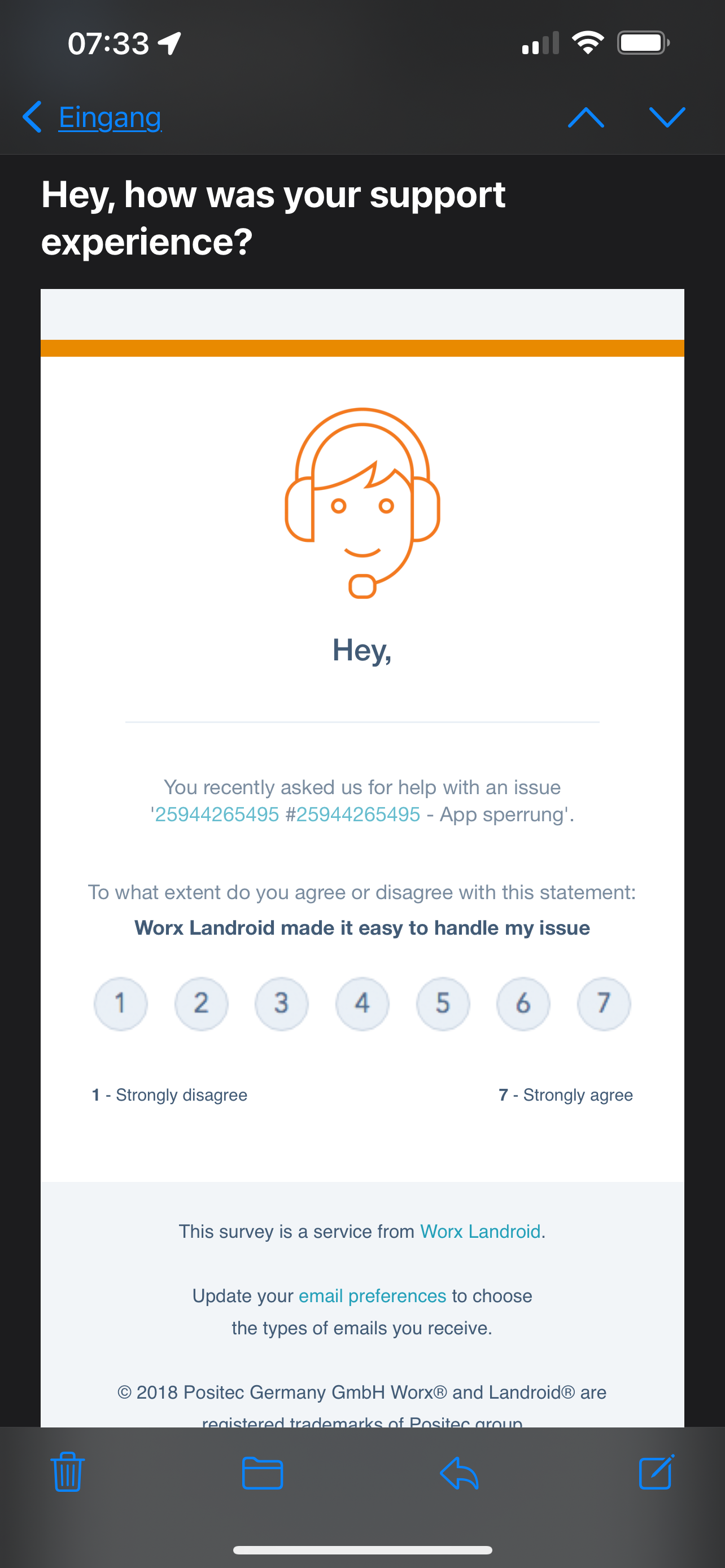 Diese Umfrage email zu der Sperrung habe ich von positec bekommen. Diese habe ich mit 1 bewertet und einen Text dazu geschrieben.
