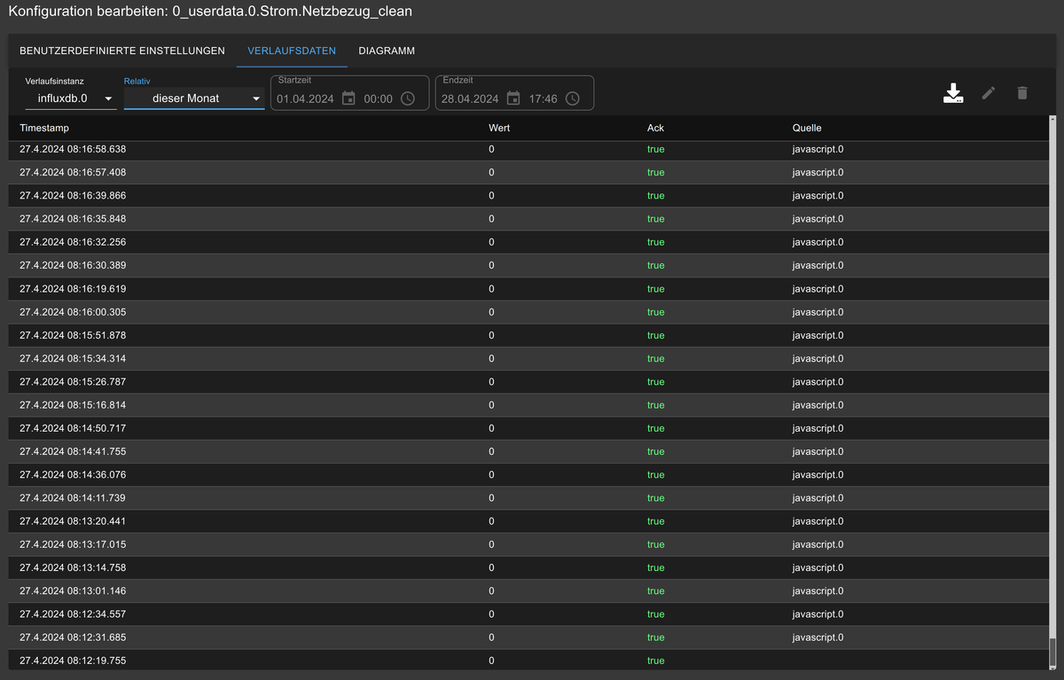 Dabei wurden die Messpunkte in "0_userdata.0.Strom.Netzbezug_clean" mit dem Wert 0 beschrieben.