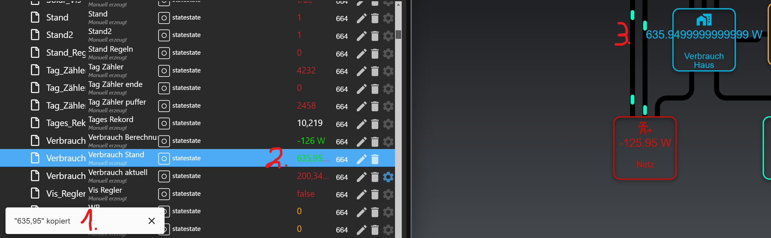 { "common": { "name": "Verbrauch Stand", "desc": "Manuell erzeugt", "role": "state", "type": "number", "read": true, "unit": "W", "write": true, "def": 0, "custom": { "history.0": { "enabled": true } } }, "type": "state", "native": {}, "_id": "0_userdata.0.Solar.Verbrauch_Stand", "acl": { "object": 1636, "state": 1636, "owner": "system.user.admin", "ownerGroup": "system.group.administrator" }, "from": "system.adapter.admin.0", "user": "system.user.admin", "ts": 1711682936938 } -
