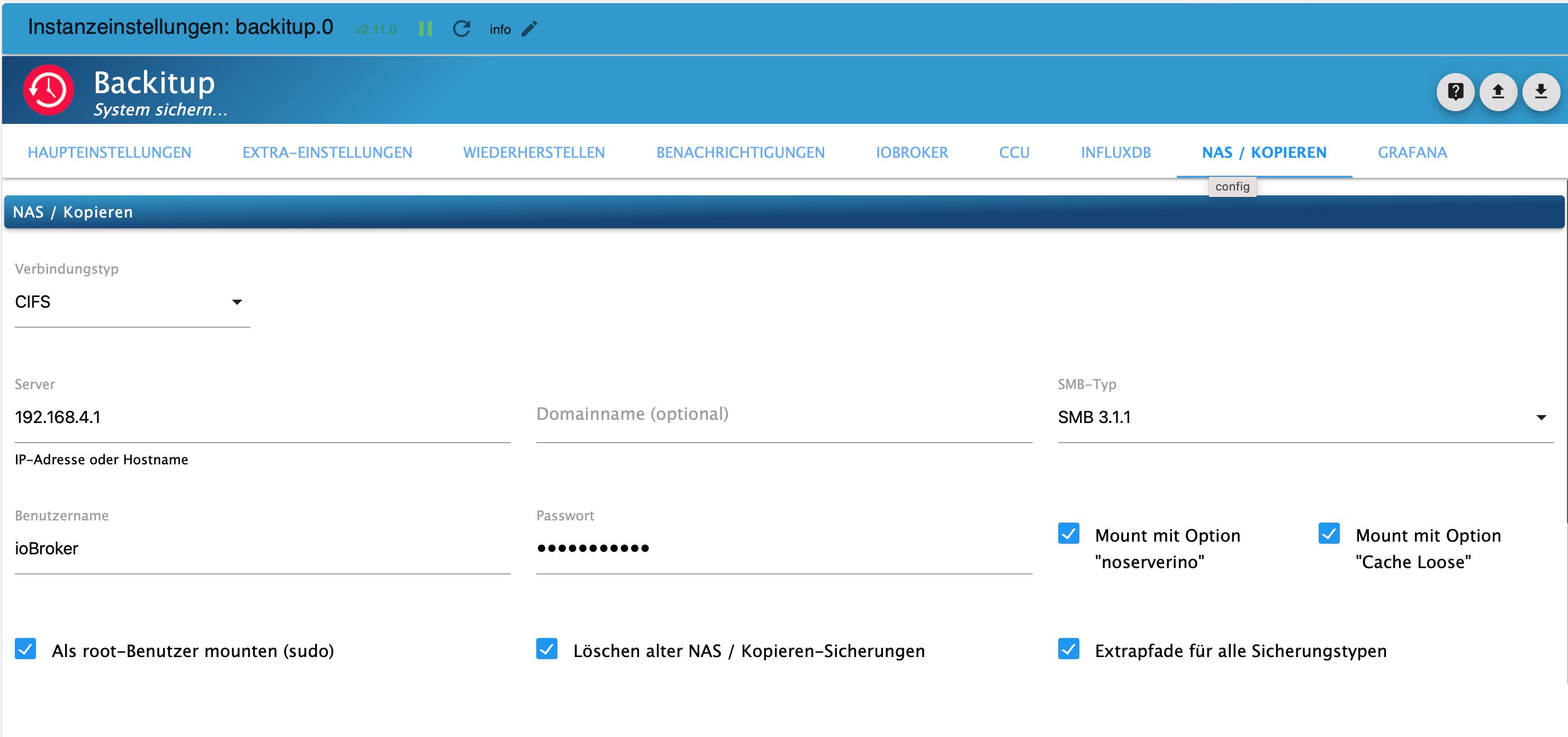 So schlimm kann das allerdings auch nicht sein. Mittlerweile kann ich ja NAS/Cifs erfolgreich in das Verzeichnis /opt/iobroker/backups manuell mounten.