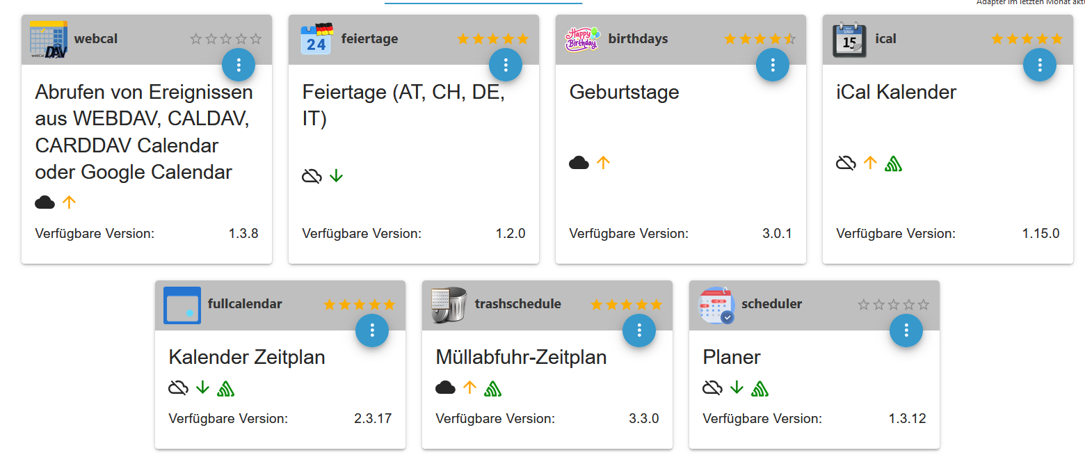 ich möchte einen Kalender in meinen iob einbauen und diesen in der Vis bearbeiten können. Daneben möchte ich auch per Java-Script darauf zugreifen können, um mir z.B. bei einem Termin eine Aktion durchführen zu können.- Gibt es da einen Adapter, welcher das kann, ohne dass ich da einen separaten Kalender wie der von Google benötige?