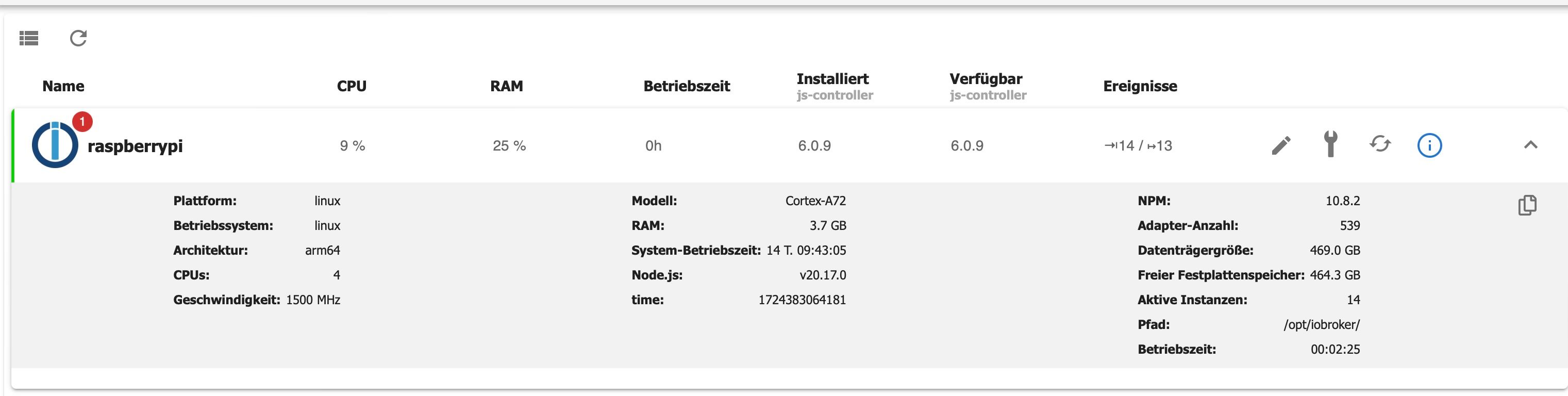 Soweit ich es hier eruieren konnte, sind aber js-controller mit Version 6.09, node.js mit 20.17.0 und NPM mit 10.8.2 aktuell.