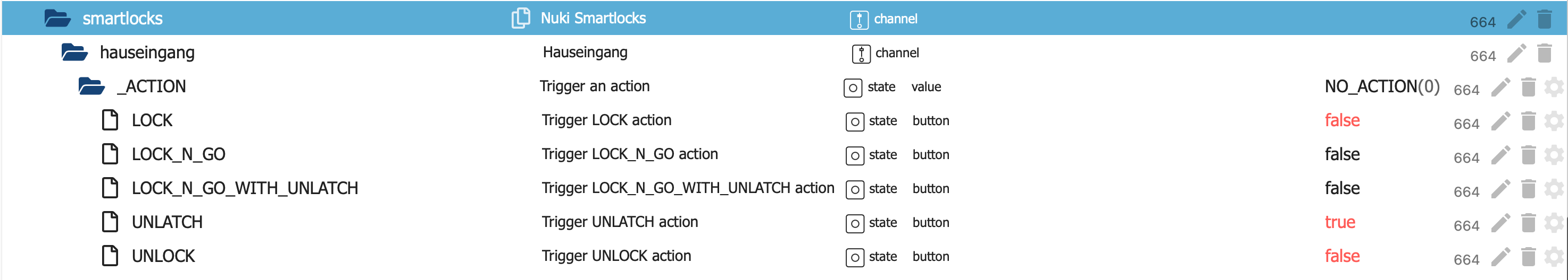 Kannst du mal bei action probieren ob dort das Nuki reagiert?Mittlerweile bin ich ein Stück weitergekommen. Wenn ich die Datenpunkte LOCK, UNLOCK, .. für 500ms auf true setzte, so erfolgen die entsprechenden Aktionen.