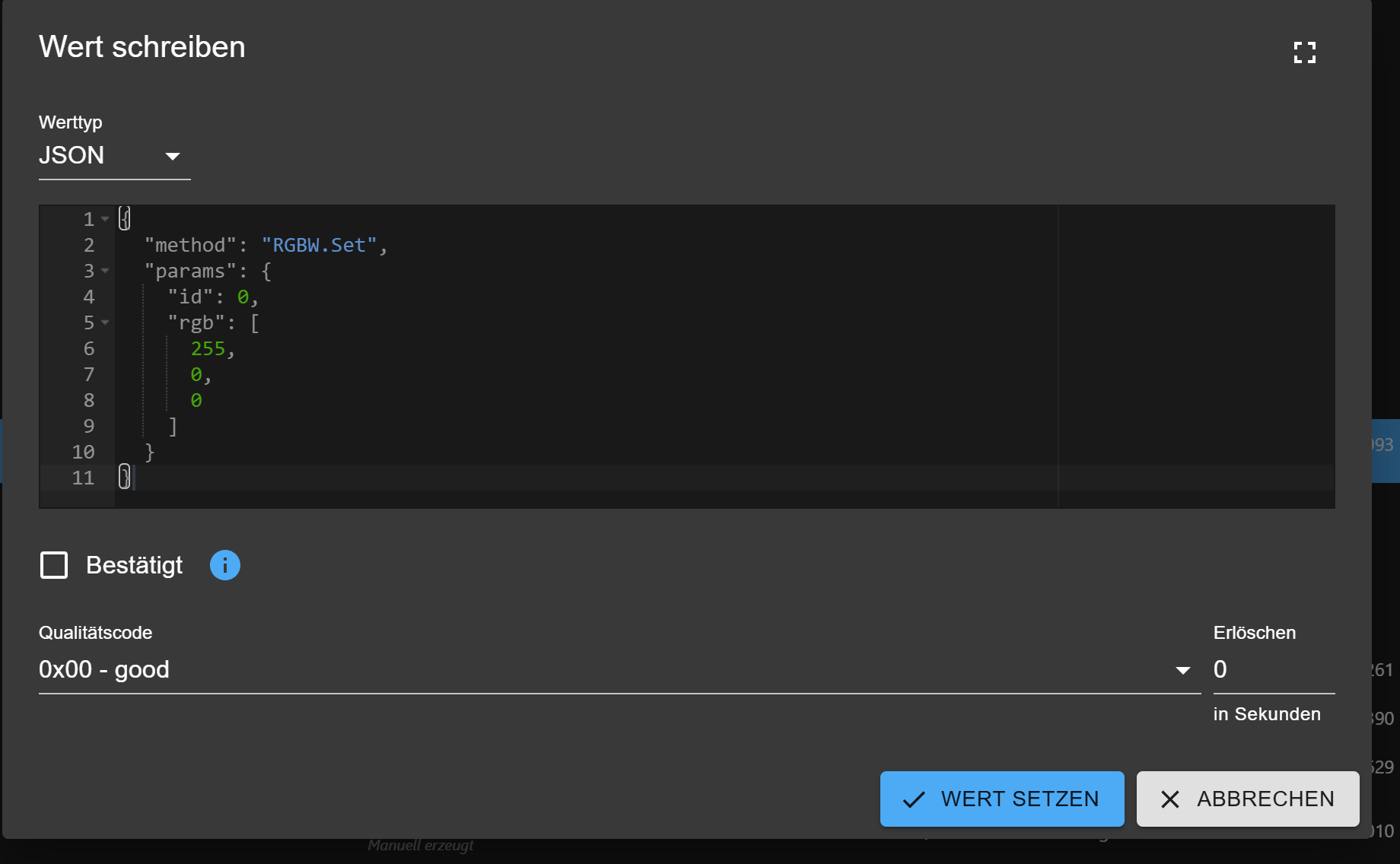 Mittlerweile habe ich aber ein weiteres Problem bei der Steuerung eines Shelly RGBW-Controllers. Ich möchte den Farbwert über ein Tripler,g,bsteuern und muss dieses Triple in folgenden JSON-String packen:{ "id": 0, "rgb": [ 255, 0, 0 ] }Dazu nutze ich in der Schreibfunktion folgende Funktion: