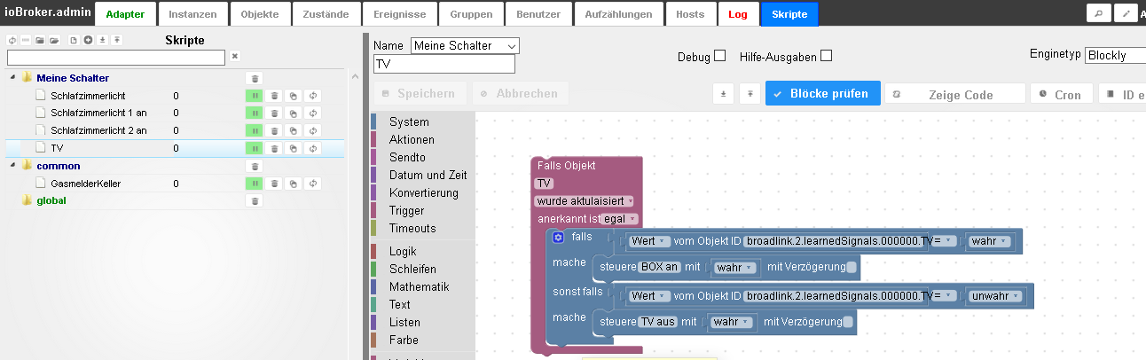Du brauchst einen überwachten State, z.B. "javascript.0.TV_Status", den kannst du in Blockly/Javascript auch anlegen lassen.