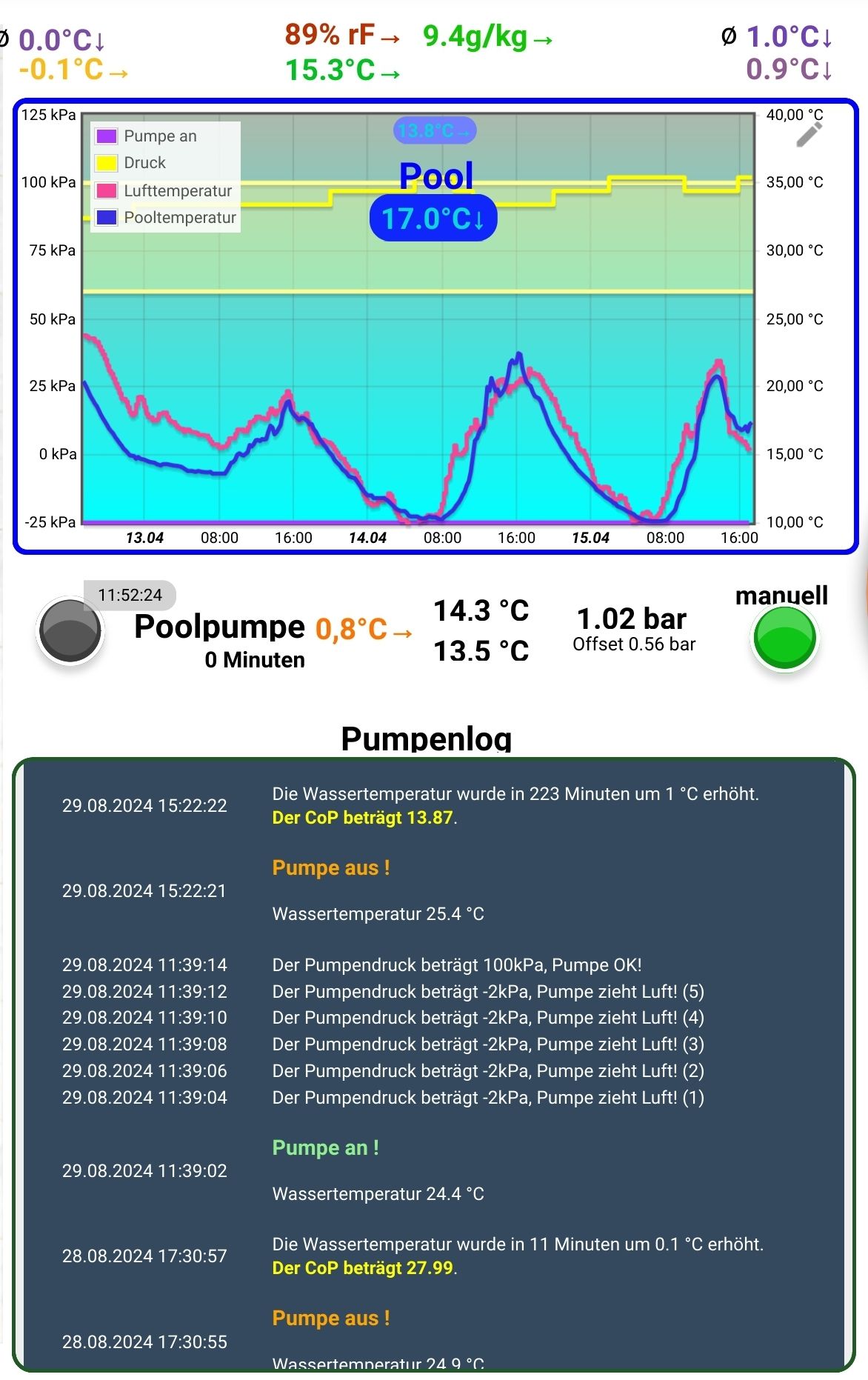 Wenn du jedesmal die Pumpe anhältst, wenn einer deiner Parameter nicht zutrifft, kommst du wahrscheinlich nur ganz selten auf die gewünschte Laufzeit.