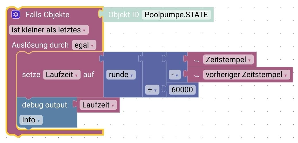Das folgende Blockly ermittelt bei jedem Ausschalten der Pumpe die tägliche Einschaltdauer in Stunden, wobei der Datenpunkt eine Nachkommastelle hat (Auflösung 6 Minuten):