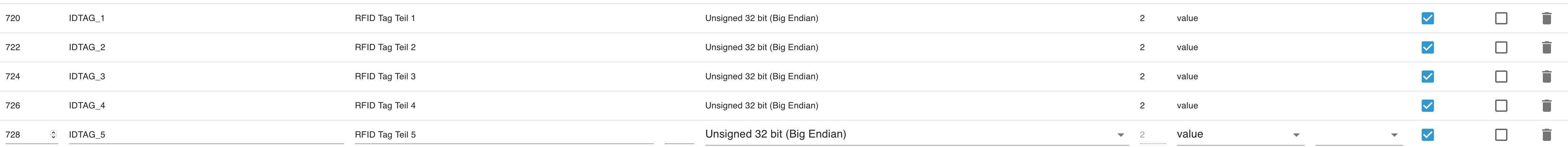 2025-05-06 21:18:59.014	debug	Add holdingRegisters.40729_IDTAG_5: {"_id":"holdingRegisters.40729_IDTAG_5","type":"state","common":{"name":"RFID Tag Teil 5","role":"value","type":"number","read":true,"write":true,"def":0,"unit":""},"native":{"regType":"holdingRegs","address":728,"deviceId":1,"type":"uint32be","len":2,"offset":0,"factor":1,"poll":true}}
