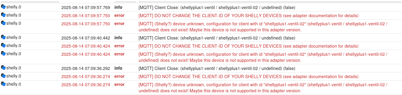 Debug /info logshelly.0 2025-08-14 00:08:29.936 debug [deviceStatusUpdate] shellyplusplugs#e465b85d9e88#1: false shelly.0 2025-08-14 00:08:29.868 debug [deviceStatusUpdate] shellyplusplugs#e465b85deb4c#1: false shelly.0 2025-08-14 00:08:29.836 debug [deviceStatusUpdate] shelly1pmminig3#34b7dac5dca0#1: false shelly.0 2025-08-14 00:08:26.915 debug [deviceStatusUpdate] shellyplusplugs#c82e1806c064#1: true shelly.0 2025-08-14 00:08:26.911 debug [onlineCheck] Checking shellyplusplugs#c82e1806c064#1 on 192.168.178.48:80 shelly.0 2025-08-14 00:08:26.866 debug [deviceStatusUpdate] shelly1pmminig3#34b7dac613cc#1: true shelly.0 2025-08-14 00:08:26.859 debug [onlineCheck] Checking shelly1pmminig3#34b7dac613cc#1 on 192.168.178.81:80 shelly.0 2025-08-14 00:08:26.858 debug [deviceStatusUpdate] shelly1pmminig3#5432046d2090#1: false shelly.0 2025-08-14 00:08:26.857 debug [onlineCheck] Checking shelly1pmminig3#5432046d2090#1 on 192.168.178.72:80 shelly.0 2025-08-14 00:08:26.856 debug [onlineCheck] Checking shellyplusplugs#e465b85d9e88#1 on 192.168.178.85:80 shelly.0 2025-08-14 00:08:26.812 debug [onlineCheck] Checking shellyplusplugs#e465b85deb4c#1 on 192.168.178.86:80 shelly.0 2025-08-14 00:08:26.784 debug [onlineCheck] Checking shelly1pmminig3#34b7dac5dca0#1 on 192.168.178.76:80 shelly.0 2025-08-14 00:08:26.718 debug [deviceStatusUpdate] shelly1pmminig3#5432044e56a0#1: true shelly.0 2025-08-14 00:08:26.718 debug [deviceStatusUpdate] shellyplusplugs#c82e1805da00#1: false shelly.0 2025-08-14 00:08:26.716 debug [onlineCheck] Checking shellyplusplugs#c82e1805da00#1 on 192.168.178.60:80 shelly.0 2025-08-14 00:08:26.715 debug [deviceStatusUpdate] shelly1pmminig3#5432044e7958#1: true shelly.0 2025-08-14 00:08:26.714 debug [onlineCheck] Checking shelly1pmminig3#5432044e56a0#1 on 192.168.178.74:80 shelly.0 2025-08-14 00:08:26.711 debug [onlineCheck] Checking shelly1pmminig3#5432044e7958#1 on 192.168.178.78:80 shelly.0 2025-08-14 00:07:36.687 debug [firmwareUpdate] Starting update on every device shelly.0 2025-08-14 00:07:29.709 debug [deviceStatusUpdate] shellyplusplugs#e465b85deb4c#1: false shelly.0 2025-08-14 00:07:29.709 debug [deviceStatusUpdate] shellyplusplugs#e465b85d9e88#1: false shelly.0 2025-08-14 00:07:29.708 debug [deviceStatusUpdate] shelly1pmminig3#34b7dac5dca0#1: false shelly.0 2025-08-14 00:07:26.747 debug [deviceStatusUpdate] Online devices: ["shelly1pmminig3#5432044e7958#1","shelly1pmminig3#5432044e56a0#1","shelly1pmminig3#34b7dac613cc#1","shellyplusplugs#c82e1806c064#1"] shelly.0 2025-08-14 00:07:26.743 debug [deviceStatusUpdate] Online devices: ["shelly1pmminig3#5432044e7958#1","shelly1pmminig3#5432044e56a0#1","shelly1pmminig3#34b7dac613cc#1"] shelly.0 2025-08-14 00:07:26.693 debug [deviceStatusUpdate] shellyplusplugs#c82e1806c064#1: true shelly.0 2025-08-14 00:07:26.692 debug [MQTT Server] Error in listener: Error: listen EADDRNOTAVAIL: address not available 192.168.178.9:1882 shelly.0 2025-08-14 00:07:26.687 info Starting in MQTT mode. Listening on 192.168.178.9:1882 (QoS 2) shelly.0 2025-08-14 00:07:26.686 info [firmwareUpdate] Auto-Update enabled - devices will be updated automatically shelly.0 2025-08-14 00:07:26.685 debug [onlineCheck] Checking shellyplusplugs#c82e1806c064#1 on 192.168.178.48:80 shelly.0 2025-08-14 00:07:26.666 debug [deviceStatusUpdate] shelly1pmminig3#34b7dac613cc#1: true shelly.0 2025-08-14 00:07:26.661 debug [onlineCheck] Checking shelly1pmminig3#34b7dac613cc#1 on 192.168.178.81:80 shelly.0 2025-08-14 00:07:26.660 debug [deviceStatusUpdate] Online devices: ["shelly1pmminig3#5432044e7958#1","shelly1pmminig3#5432044e56a0#1"] shelly.0 2025-08-14 00:07:26.658 debug [deviceStatusUpdate] shelly1pmminig3#5432046d2090#1: false shelly.0 2025-08-14 00:07:26.657 debug [onlineCheck] Checking shelly1pmminig3#5432046d2090#1 on 192.168.178.72:80 shelly.0 2025-08-14 00:07:26.656 debug [deviceStatusUpdate] Online devices: ["shelly1pmminig3#5432044e7958#1"] shelly.0 2025-08-14 00:07:26.654 debug [onlineCheck] Checking shellyplusplugs#e465b85d9e88#1 on 192.168.178.85:80 shelly.0 2025-08-14 00:07:26.652 debug [onlineCheck] Checking shellyplusplugs#e465b85deb4c#1 on 192.168.178.86:80 shelly.0 2025-08-14 00:07:26.638 debug [onlineCheck] Checking shelly1pmminig3#34b7dac5dca0#1 on 192.168.178.76:80 shelly.0 2025-08-14 00:07:26.616 debug [deviceStatusUpdate] shelly1pmminig3#5432044e56a0#1: true shelly.0 2025-08-14 00:07:26.613 debug [deviceStatusUpdate] shellyplusplugs#c82e1805da00#1: false shelly.0 2025-08-14 00:07:26.612 debug [deviceStatusUpdate] shelly1pmminig3#5432044e7958#1: true shelly.0 2025-08-14 00:07:26.610 debug [onlineCheck] Checking shellyplusplugs#c82e1805da00#1 on 192.168.178.60:80 shelly.0 2025-08-14 00:07:26.609 debug [onlineCheck] Checking shelly1pmminig3#5432044e56a0#1 on 192.168.178.74:80 shelly.0 2025-08-14 00:07:26.607 debug [onlineCheck] Checking shelly1pmminig3#5432044e7958#1 on 192.168.178.78:80 shelly.0 2025-08-14 00:07:26.426 info starting. Version 10.1.0 in /opt/iobroker/node_modules/iobroker.shelly, node: v22.16.0, js-controller: 7.0.6 shelly.0 2025-08-14 00:07:26.362 debug Plugin sentry Do not initialize Plugin (enabled=false) shelly.0 2025-08-14 00:07:26.344 debug States connected to redis: 127.0.0.1:9000 shelly.0 2025-08-14 00:07:26.288 debug States create User PubSub Client shelly.0 2025-08-14 00:07:26.287 debug States create System PubSub Client shelly.0 2025-08-14 00:07:26.276 debug Redis States: Use Redis connection: 127.0.0.1:9000 shelly.0 2025-08-14 00:07:26.252 debug Objects connected to redis: 127.0.0.1:9001 shelly.0 2025-08-14 00:07:26.250 debug Objects client initialize lua scripts shelly.0 2025-08-14 00:07:26.223 debug Objects create User PubSub Client shelly.0 2025-08-14 00:07:26.222 debug Objects create System PubSub Client shelly.0 2025-08-14 00:07:26.221 debug Objects client ready ... initialize now shelly.0 2025-08-14 00:07:26.205 debug Redis Objects: Use Redis connection: 127.0.0.1:9001 shelly.0 2025-08-14 00:07:22.129 info terminating shel