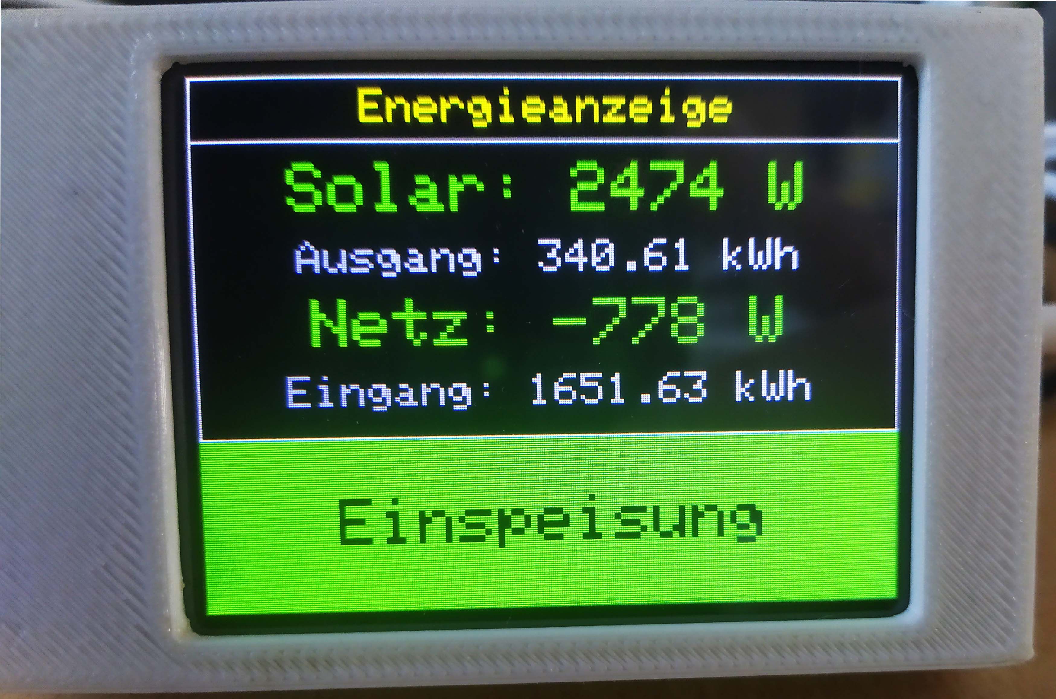Es verbindet sich mit dem WLAN, ruft Energiedaten von einer OpenDTU und einem Tasmota-basierten Stromzähler ab, zeigt die Werte auf einem TFT-Display an und stellt zusätzlich ein Web-Dashboard zur Verfügung.