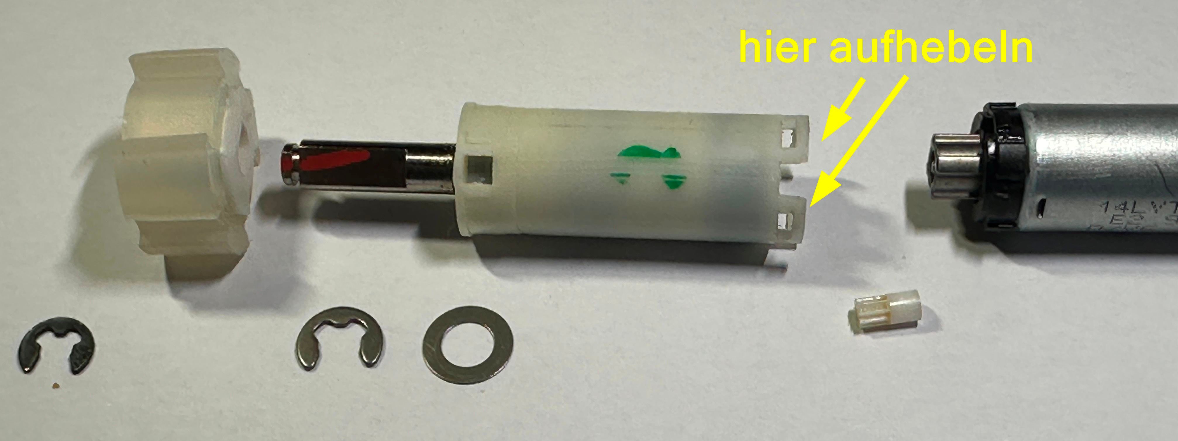Evtl. auch gleich das kleine weiße Zahnrad entnehmen und in Sicherheit bringen, bevor es verloren geht (Wenn das ganze am Ende wieder zusammengebaut wird, darauf achten dass der Schaft eine D-Form hat)