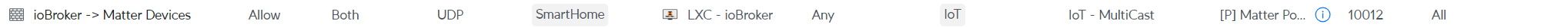 Regeln gemäß der Grafik oben konfigurieren. Für Source die Geräte direkt auswählen, für Destination Objekte erstellen und verwenden. Wichtig da sich die IPv6 Adressen von den Matter Geräten (VLAN 20) ändern können, habe ich dem ioBroker Zugriff auf das VLAN 20 gegeben (Firewall Regel mit roter linie, Destination ist hier VLAN 20), so sieht das im Detail aus: