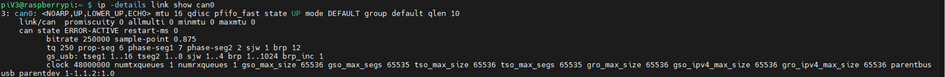 Auf dem Raspberry ergibt die Abfrage "ip -details link show can0" folgende Auswertung.
