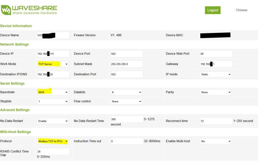 - Waveshare Modbus RS485-to-ETH