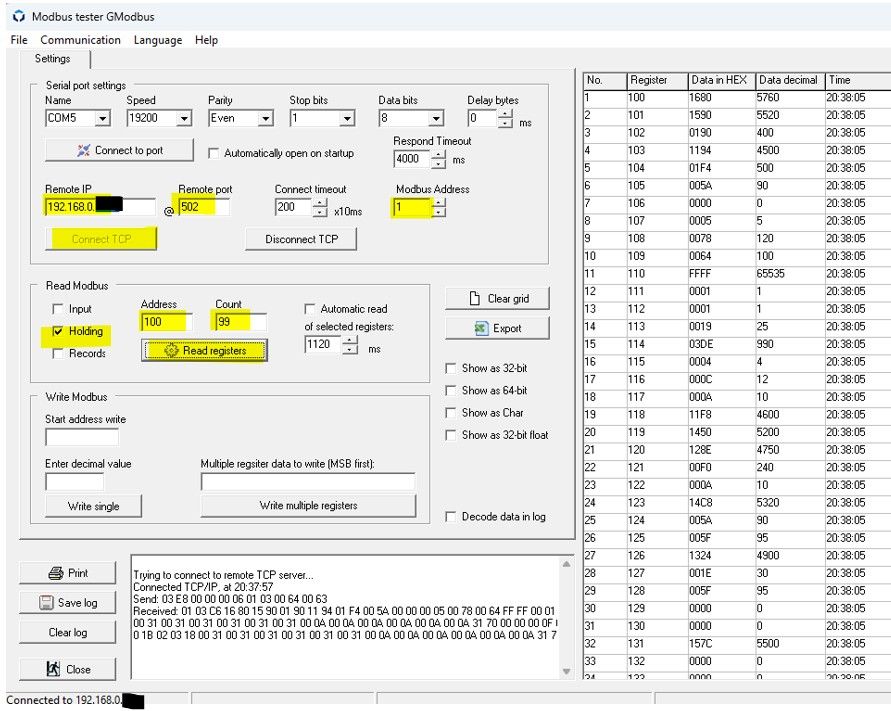 Wenn man damit auch keinen Erfolg hat, kann man noch diverse Modbus-Tools zum Lokalisieren von Registernummern einsetzen, etwa GModbus. Damit werden die verfügbaren Registernummern samt Werten aufgelistet. Das Abfragen geht leider etwas mühsam. Man muss die Adressnummern etappenweise eingeben und kann den Count auf max. 120 stellen.