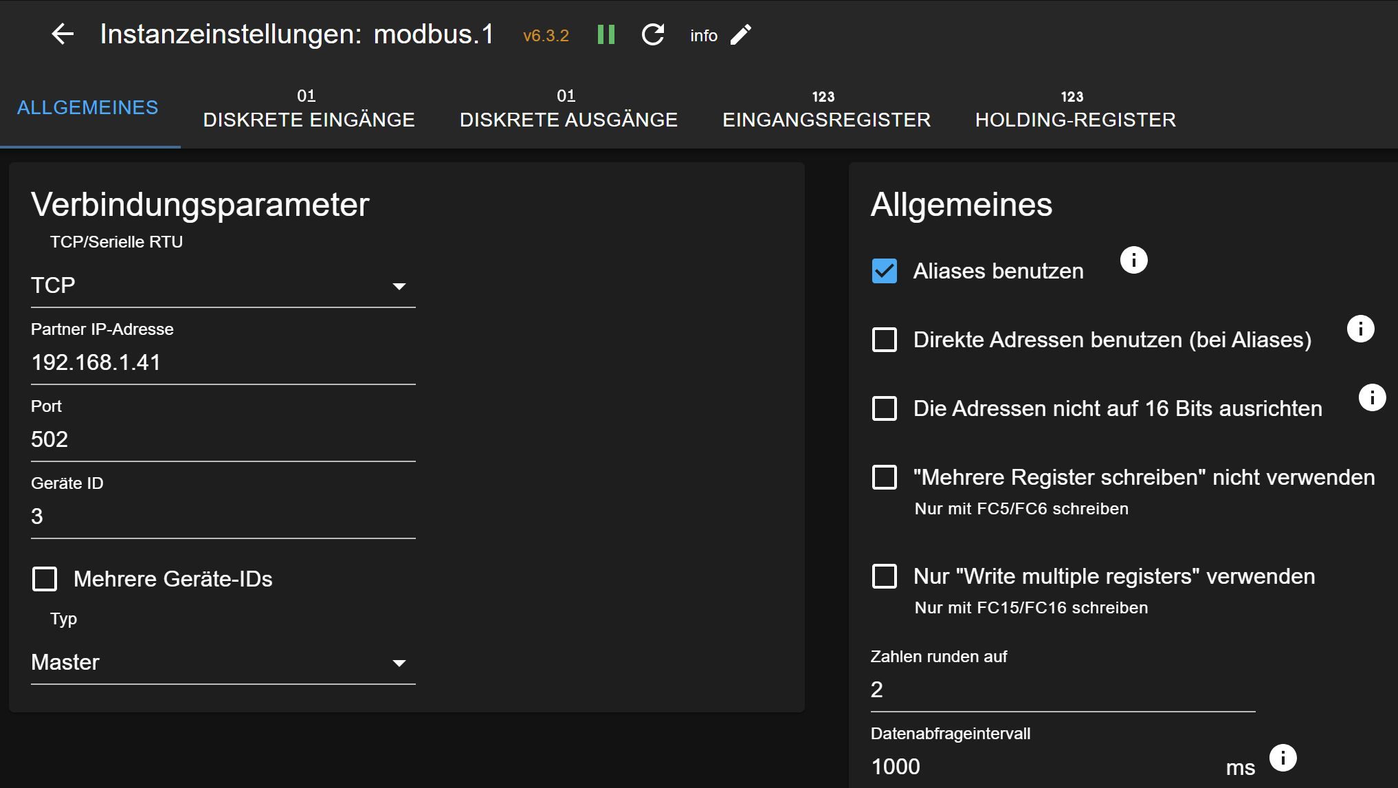 mein neuer Wechselrichter SMA Sunny Tripower-10 ist angeschlossen und arbeitet. Die Integration in ioBroker dagegen nicht. Die modbus.1 Instanz wird nicht aktiv. Nach meinem Dafürhalten habe ich die relevanten Parameter richtig eingetragen.