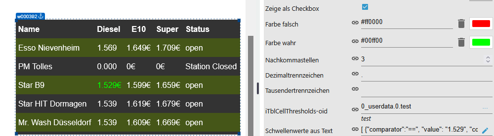 [ {"comparator":"==", "value": 1.529, "color":"#00ff00"} ] meinem Json wert eine farbe zuordnen. Ich möchte die Farbe aber basierend auf dep DP zuordnen, dafür ist ja wohl iTblCellThresholds-oid da, aber wie muss ich [ {"comparator":"==", "value": 1.529, "color":"#00ff00"} ] verändern, um den Wert aus iTblCellThresholds-oid zu lesen?
