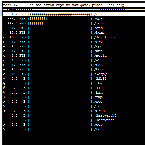 df -h Dateisystem Größe Benutzt Verf. Verw% Eingehängt auf /dev/loop3 9,8G 8,0G 1,3G 87% / /dev/sdb 3,6T 2,6T 889G 75% /Daten none 492K 4,0K 488K 1% /dev tmpfs 16G 0 16G 0% /dev/shm tmpfs 6,3G 9,4M 6,3G 1% /run tmpfs 5,0M 0 5,0M 0% /run/lock tmpfs 16G 0 16G 0% /tmp tmpfs 1,0M 0 1,0M 0% /run/credentials/systemd-journald.service tmpfs 1,0M 0 1,0M 0% /run/credentials/console-getty.service tmpfs 1,0M 0 1,0M 0% /run/credentials/container-getty@2.service tmpfs 1,0M 0 1,0M 0% /run/credentials/container-getty@1.service- die gui: