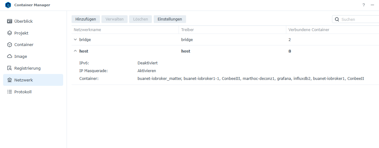 Ich habe jetzt im Containermanager auf der Synology geschaut.