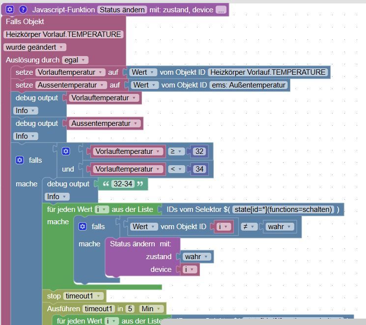Wer könnte da helfen? Danke und Grüßevar zustand, device, Vorlauftemperatur, Aussentemperatur, i, timeout1, timeout2; // Beschreibe diese Funktion … async function Status__C3_A4ndern(zustand, device) { setState(device, zustand, false); } on({ id: 'hm-rpc.1.MEQ1598670.2.TEMPERATURE' /* Heizkörper Vorlauf.TEMPERATURE */, change: 'ne' }, async (obj) => { let value = obj.state.val; let oldValue = obj.oldState.val; Vorlauftemperatur = getState('hm-rpc.1.MEQ1598670.2.TEMPERATURE').val; Aussentemperatur = getState('ems-esp.0.boiler.outdoortemp').val; console.info(Vorlauftemperatur); console.info(Aussentemperatur); if ((Vorlauftemperatur >= 32) && (Vorlauftemperatur < 34)) { console.info('32-34'); var i_list = Array.prototype.slice.apply($('state[id=*](functions=schalten)')); for (var i_index in i_list) { i = i_list[i_index]; if (getState(i).val != true) { await Status__C3_A4ndern(true, i); } } (() => { if (timeout1) { clearTimeout(timeout1); timeout1 = null; }})(); timeout1 = setTimeout(async () => { timeout1 = null; var i_list2 = Array.prototype.slice.apply($('state[id=*](functions=schalten)')); for (var i_index2 in i_list2) { i = i_list2[i_index2]; await Status__C3_A4ndern(false, i); } }, 300000); } else if (Vorlauftemperatur >= 34) { console.info('34'); var i_list3 = Array.prototype.slice.apply($('state[id=*](functions=schalten)')); for (var i_index3 in i_list3) { i = i_list3[i_index3]; if (getState(i).val != true) { await Status__C3_A4ndern(true, i); } } (() => { if (timeout2) { clearTimeout(timeout2); timeout2 = null; }})(); timeout2 = setTimeout(async () => { timeout2 = null; var i_list4 = Array.prototype.slice.apply($('state[id=*](functions=schalten)')); for (var i_index4 in i_list4) { i = i_list4[i_index4]; await Status__C3_A4ndern(false, i); } }, 600000); } }); on({ id: 'hm-rpc.1.MEQ1598670.2.TEMPERATURE' /* Heizkörper Vorlauf.TEMPERATURE */, change: 'ne' }, async (obj) => { let value = obj.state.val; let oldValue = obj.oldState.val; Vorlauftemperatur = getState('hm-rpc.1.MEQ1598670.2.TEMPERATURE').val; Aussentemperatur = getState('ems-esp.0.boiler.outdoortemp').val; if ((Vorlauftemperatur >= 32) && (Vorlauftemperatur < 39)) { var i_list5 = Array.prototype.slice.apply($('state[id=*](functions=schalten)')); for (var i_index5 in i_list5) { i = i_list5[i_index5]; setState('Object ID', ); } } }); //JTNDeG1sJTIweG1sbnMlM0QlMjJodHRwcyUzQSUyRiUyRmRldmVsb3BlcnMuZ29vZ2xlLmNvbSUyRmJsb2NrbHklMkZ4bWwlMjIlM0UlM0N2YXJpYWJsZXMlM0UlM0N2YXJpYWJsZSUyMGlkJTNEJTIycCUyNU9vcEIlN0MlM0Fval9pIXUlM0IlMkZmMjYlM0YlMjIlM0V6dXN0YW5kJTNDJTJGdmFyaWFibGUlM0UlM0N2YXJpYWJsZSUyMGlkJTNEJTIyNnIlNjBrNGhZJTVCbSF4UEtmdEoxS3ZDJTIyJTNFZGV2aWNlJTNDJTJGdmFyaWFibGUlM0UlM0N2YXJpYWJsZSUyMGlkJTNEJTIyYVMlMkJHTC1kemJlcFpIcnZtJTVEJTVEY3AlMjIlM0VWb3JsYXVmdGVtcGVyYXR1ciUzQyUyRnZhcmlhYmxlJTNFJTNDdmFyaWFibGUlMjBpZCUzRCUyMjF4dzNvLi1yQiU3RHMhLmhKQkF6cGclMjIlM0VBdXNzZW50ZW1wZXJhdHVyJTNDJTJGdmFyaWFibGUlM0UlM0N2YXJpYWJsZSUyMGlkJTNEJTIyJTJGXyU3Q3llaGglMkJlVyUzRiU1RTZfWmlZcFolMkIlMjIlM0VpJTNDJTJGdmFyaWFibGUlM0UlM0N2YXJpYWJsZSUyMHR5cGUlM0QlMjJ0aW1lb3V0JTIyJTIwaWQlM0QlMjJ0aW1lb3V0MSUyMiUzRXRpbWVvdXQxJTNDJTJGdmFyaWFibGUlM0UlM0N2YXJpYWJsZSUyMHR5cGUlM0QlMjJ0aW1lb3V0JTIyJTIwaWQlM0QlMjJ0aW1lb3V0MiUyMiUzRXRpbWVvdXQyJTNDJTJGdmFyaWFibGUlM0UlM0MlMkZ2YXJpYWJsZXMlM0UlM0NibG9jayUyMHR5cGUlM0QlMjJwcm9jZWR1cmVzX2RlZmN1c3RvbW5vcmV0dXJuJTIyJTIwaWQlM0QlMjJVTiU0MEVycCU3RCk1KHFVY2VrdmclMjV5JTVFJTIyJTIweCUzRCUyMi01NjIlMjIlMjB5JTNEJTIyLTY2MiUyMiUzRSUzQ211dGF0aW9uJTIwc3RhdGVtZW50cyUzRCUyMmZhbHNlJTIyJTNFJTNDYXJnJTIwbmFtZSUzRCUyMnp1c3RhbmQlMjIlMjB2YXJpZCUzRCUyMnAlMjVPb3BCJTdDJTNBb2pfaSF1JTNCJTJGZjI2JTNGJTIyJTNFJTNDJTJGYXJnJTNFJTNDYXJnJTIwbmFtZSUzRCUyMmRldmljZSUyMiUyMHZhcmlkJTNEJTIyNnIlNjBrNGhZJTVCbSF4UEtmdEoxS3ZDJTIyJTNFJTNDJTJGYXJnJTNFJTNDJTJGbXV0YXRpb24lM0UlM0NmaWVsZCUyMG5hbWUlM0QlMjJOQU1FJTIyJTNFU3RhdHVzJTIwJUMzJUE0bmRlcm4lM0MlMkZmaWVsZCUzRSUzQ2ZpZWxkJTIwbmFtZSUzRCUyMlNDUklQVCUyMiUzRWMyVjBVM1JoZEdVb1pHVjJhV05sTENCNmRYTjBZVzVrTENCbVlXeHpaU2s3JTNDJTJGZmllbGQlM0UlM0Njb21tZW50JTIwcGlubmVkJTNEJTIyZmFsc2UlMjIlMjBoJTNEJTIyODAlMjIlMjB3JTNEJTIyMTYwJTIyJTNFQmVzY2hyZWliZSUyMGRpZXNlJTIwRnVua3Rpb24lMjAlRTIlODAlQTYlM0MlMkZjb21tZW50JTNFJTNDJTJGYmxvY2slM0UlM0NibG9jayUyMHR5cGUlM0QlMjJvbiUyMiUyMGlkJTNEJTIySE0lMjREdHh1dGFNRiU3Q3IzV2lFSjBjJTIyJTIweCUzRCUyMi01NjIlMjIlMjB5JTNEJTIyLTYzNyUyMiUzRSUzQ2ZpZWxkJTIwbmFtZSUzRCUyMk9JRCUyMiUzRWhtLXJwYy4xLk1FUTE1OTg2NzAuMi5URU1QRVJBVFVSRSUzQyUyRmZpZWxkJTNFJTNDZmllbGQlMjBuYW1lJTNEJTIyQ09ORElUSU9OJTIyJTNFbmUlM0MlMkZmaWVsZCUzRSUzQ2ZpZWxkJTIwbmFtZSUzRCUyMkFDS19DT05ESVRJT04lMjIlM0UlM0MlMkZmaWVsZCUzRSUzQ3N0YXRlbWVudCUyMG5hbWUlM0QlMjJTVEFURU1FTlQlMjIlM0UlM0NibG9jayUyMHR5cGUlM0QlMjJ2YXJpYWJsZXNfc2V0JTIyJTIwaWQlM0QlMjJWcyU3RE9HazFpTEElN0QzUCUzREpPSUxfVSUyMiUzRSUzQ2ZpZWxkJTIwbmFtZSUzRCUyMlZBUiUyMiUyMGlkJTNEJTIyYVMlMkJHTC1kemJlcFpIcnZtJTVEJTVEY3AlMjIlM0VWb3JsYXVmdGVtcGVyYXR1ciUzQyUyRmZpZWxkJTNFJTNDdmFsdWUlMjBuYW1lJTNEJTIyVkFMVUUlMjIlM0UlM0NibG9jayUyMHR5cGUlM0QlMjJnZXRfdmFsdWUlMjIlMjBpZCUzRCUyMmQpTm04JTI0bDVaRnklN0MlMjRsUSU1RHIlNjB3VyUyMiUzRSUzQ2ZpZWxkJTIwbmFtZSUzRCUyMkFUVFIlMjIlM0V2YWwlM0MlMkZmaWVsZCUzRSUzQ2ZpZWxkJTIwbmFtZSUzRCUyMk9JRCUyMiUzRWhtLXJwYy4xLk1FUTE1OTg2NzAuMi5URU1QRVJBVFVSRSUzQyUyRmZpZWxkJTNFJTNDJTJGYmxvY2slM0UlM0MlMkZ2YWx1ZSUzRSUzQ25leHQlM0UlM0NibG9jayUyMHR5cGUlM0QlMjJ2YXJpYWJsZXNfc2V0JTIyJTIwaWQlM0QlMjIlMjMlNUJVQykyQVgzNSUyNTBINyUyQ3hwJTdDJTJDeiUyMiUzRSUzQ2ZpZWxkJTIwbmFtZSUzRCUyMlZBUiUyMiUyMGlkJTNEJTIyMXh3M28uLXJCJTdEcyEuaEpCQXpwZyUyMiUzRUF1c3NlbnRlbXBlcmF0dXIlM0MlMkZmaWVsZCUzRSUzQ3ZhbHVlJTIwbmFtZSUzRCUyMlZBTFVFJTIyJTNFJTNDYmxvY2slMjB0eXBlJTNEJTIyZ2V0X3ZhbHVlJTIyJTIwaWQlM0QlMjJJKVlmTmpoRlElN0RrVXJPSSU2MG1zMHolMjIlM0UlM0NmaWVsZCUyMG5hbWUlM0QlMjJBVFRSJTIyJTNFdmFsJTNDJTJGZmllbGQlM0UlM0NmaWVsZCUyMG5hbWUlM0QlMjJPSUQlMjIlM0VlbXMtZXNwLjAuYm9pbGVyLm91dGRvb3J0ZW1wJTNDJTJGZmllbGQlM0UlM0MlMkZibG9jayUzRSUzQyUyRnZhbHVlJTNFJTNDbmV4dCUzRSUzQ2Jsb2NrJTIwdHlwZSUzRCUyMmRlYnVnJTIyJTIwaWQlM0QlMjJkJTVFVm5Qajl6U3N6d29zOFdXWDU1JTIyJTNFJTNDZmllbGQlMjBuYW1lJTNEJTIyU2V2ZXJpdHklMjIlM0VpbmZvJTNDJTJGZmllbGQlM0UlM0N2YWx1ZSUyMG5hbWUlM0QlMjJURVhUJTIyJTNFJTNDc2hhZG93JTIwdHlwZSU