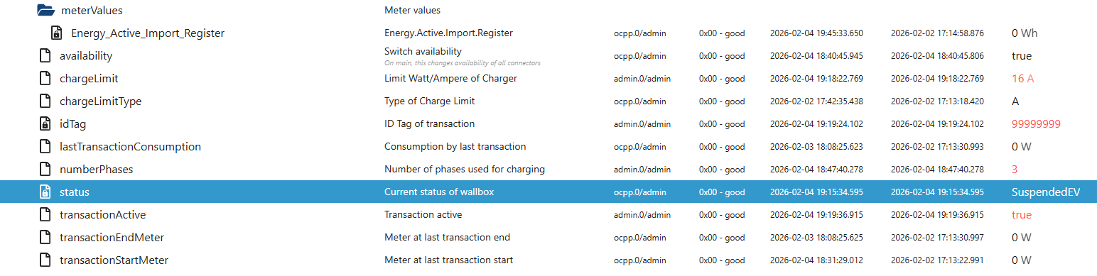 transactionActiveauffalseund gib beichargeLimitin Buchstabennullein, dann sollte bei EinschaltentransactionActivder Strom fließen (SuspendedEVbedeutet, dass das Kabel eingesteckt ist). -